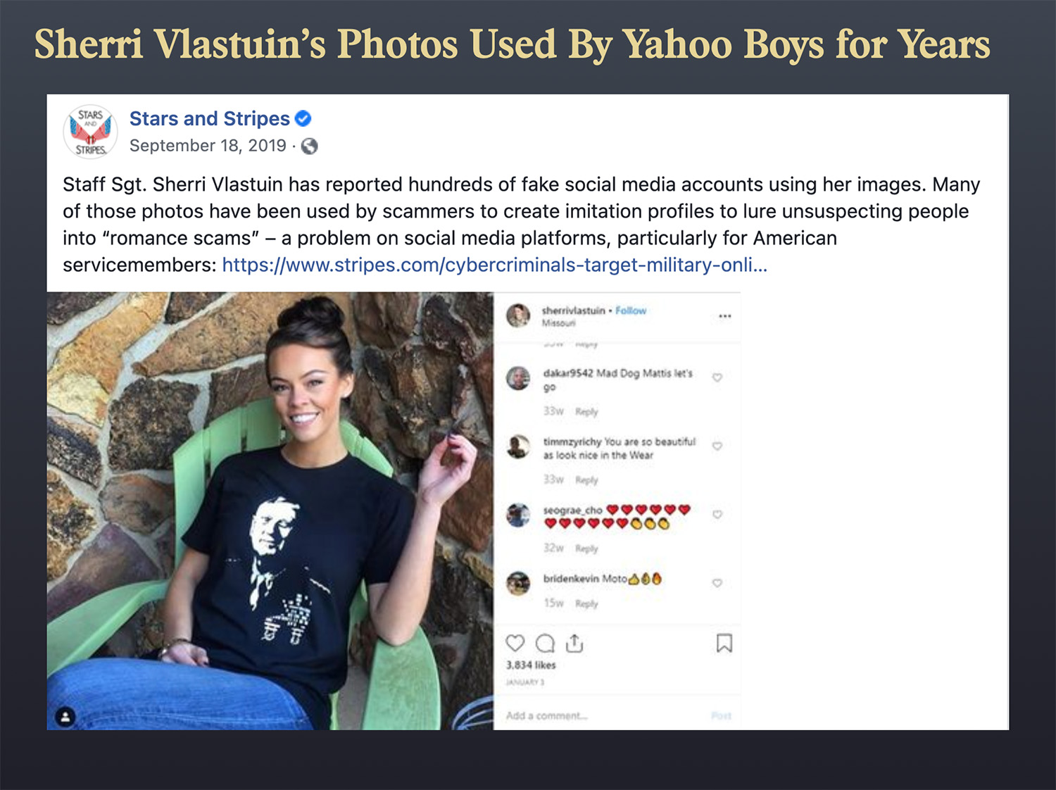 Staff Sgt Sherri Vlastuin might be in one of those packages that are sold and resold to new scammers. Her photos and images have been used for years by scammers that appear to follow the Yahoo Boys format.
