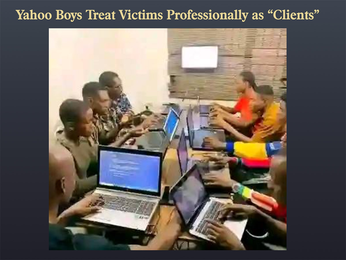 Yahoo boys never refer to the scam victims in a negative light, instead they refer to them as “clients” as if there is some benefit the victim is receiving as part of the arrangement.