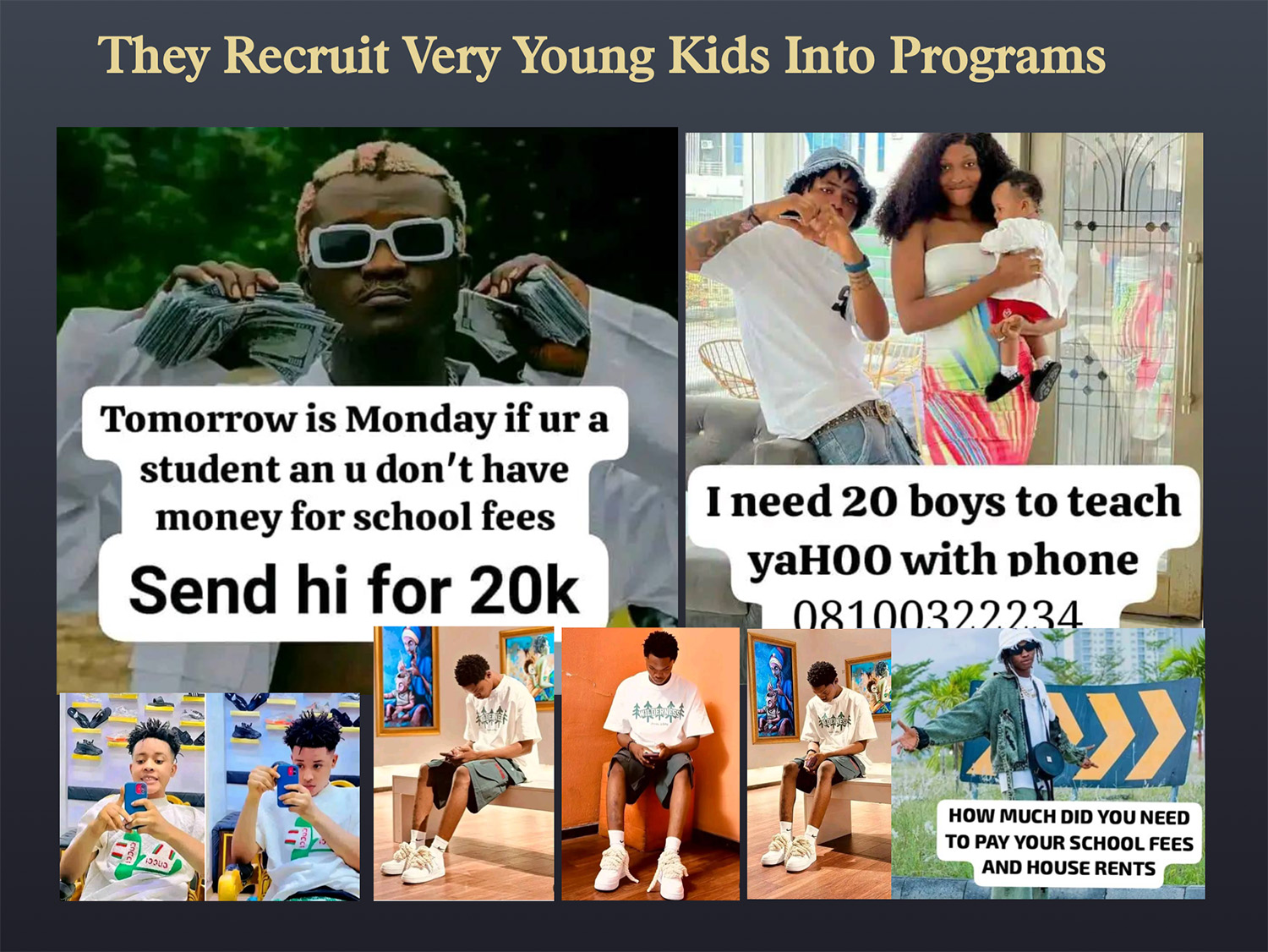 For recruitment, hundreds of “Yahoo Boy Universities” have sprung up everywhere. These are places where young people can work with mentors to learn the tricks of the trade for scamming and even extorting people in the US.