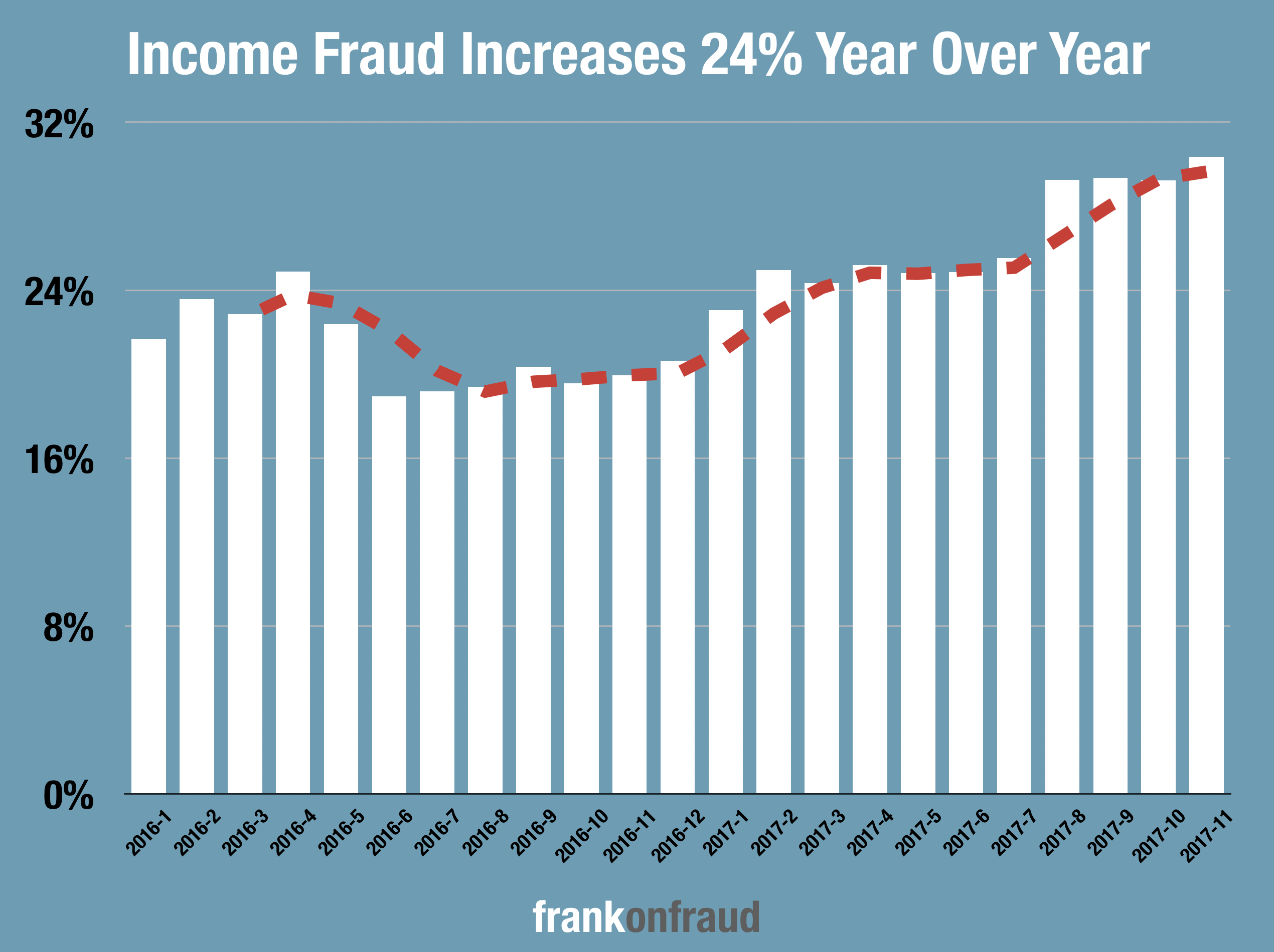 Look for increases in application fraud in 2019 – in particular, income fraud which will drive up both auto and mortgage application fraud rates.  Analysis by PointPredictive indicates that income-related misrepresentation increased over 24% during 2018 and the trend looks to go higher.