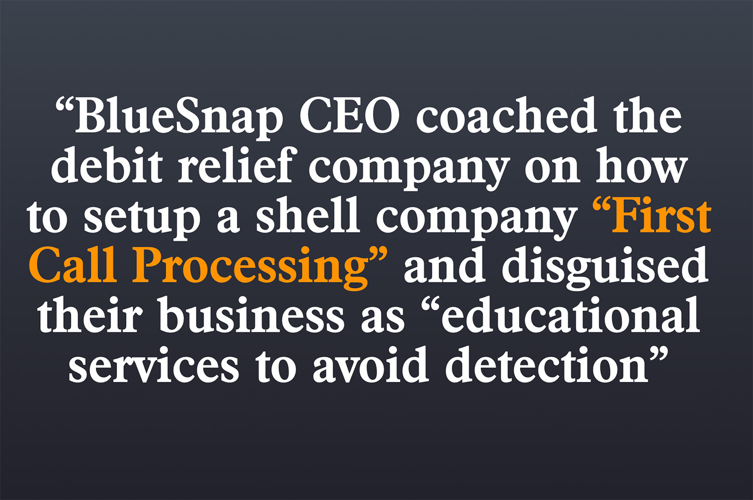 BlueSnap opened a new merchant account for this shell company, First Call Processing, in May 2021. It processed over $3 million in just a few weeks before BlueSnap’s processing partner demanded the account be terminated due to excessive chargebacks and evidence the company sold prohibited debt relief services. Undeterred, Dangelmaier and Monteith allegedly directed ACRO Services to resume processing through another existing account.