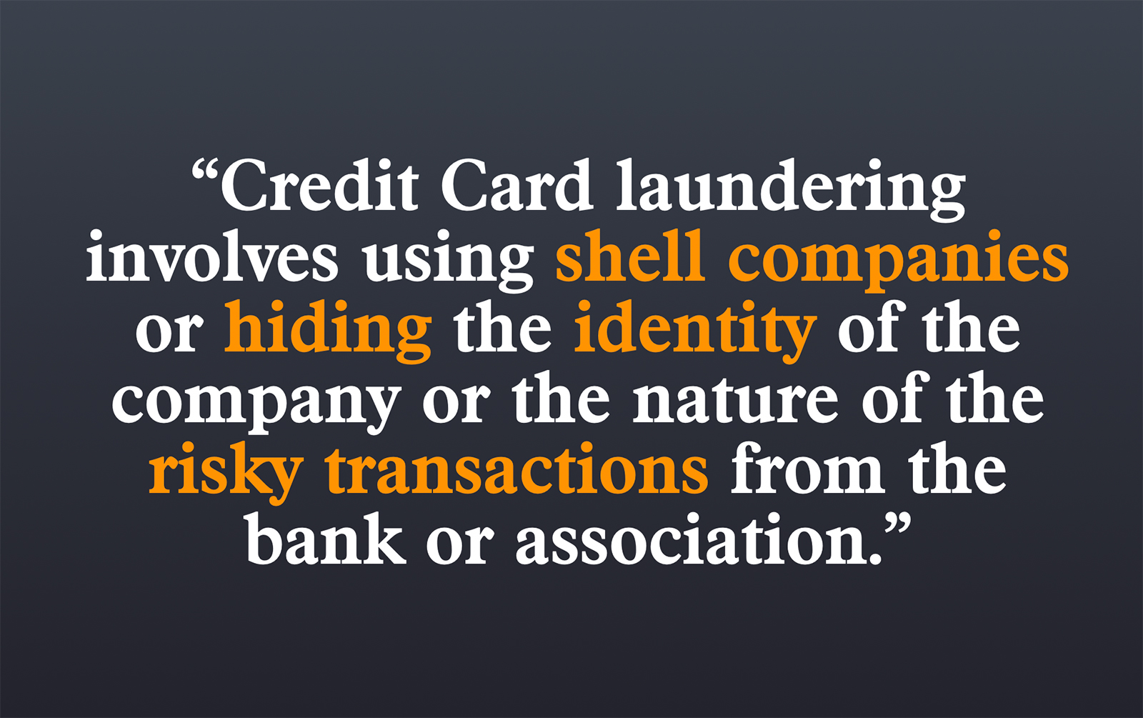 Laundering typically involves processing transactions through another company’s account or concealing one’s identity from consumers, banks, and card networks, using shell companies, or hiding the true nature of one’s business.