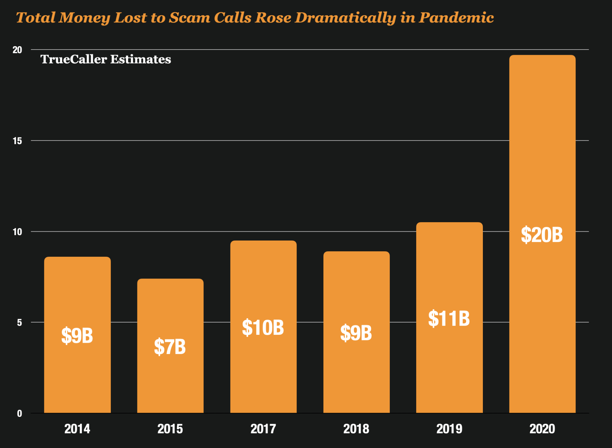 True Caller estimates that there was approximately $20 Billion lost to scams over the phone in 2020 – a dramatic 90% increase over 2019.
