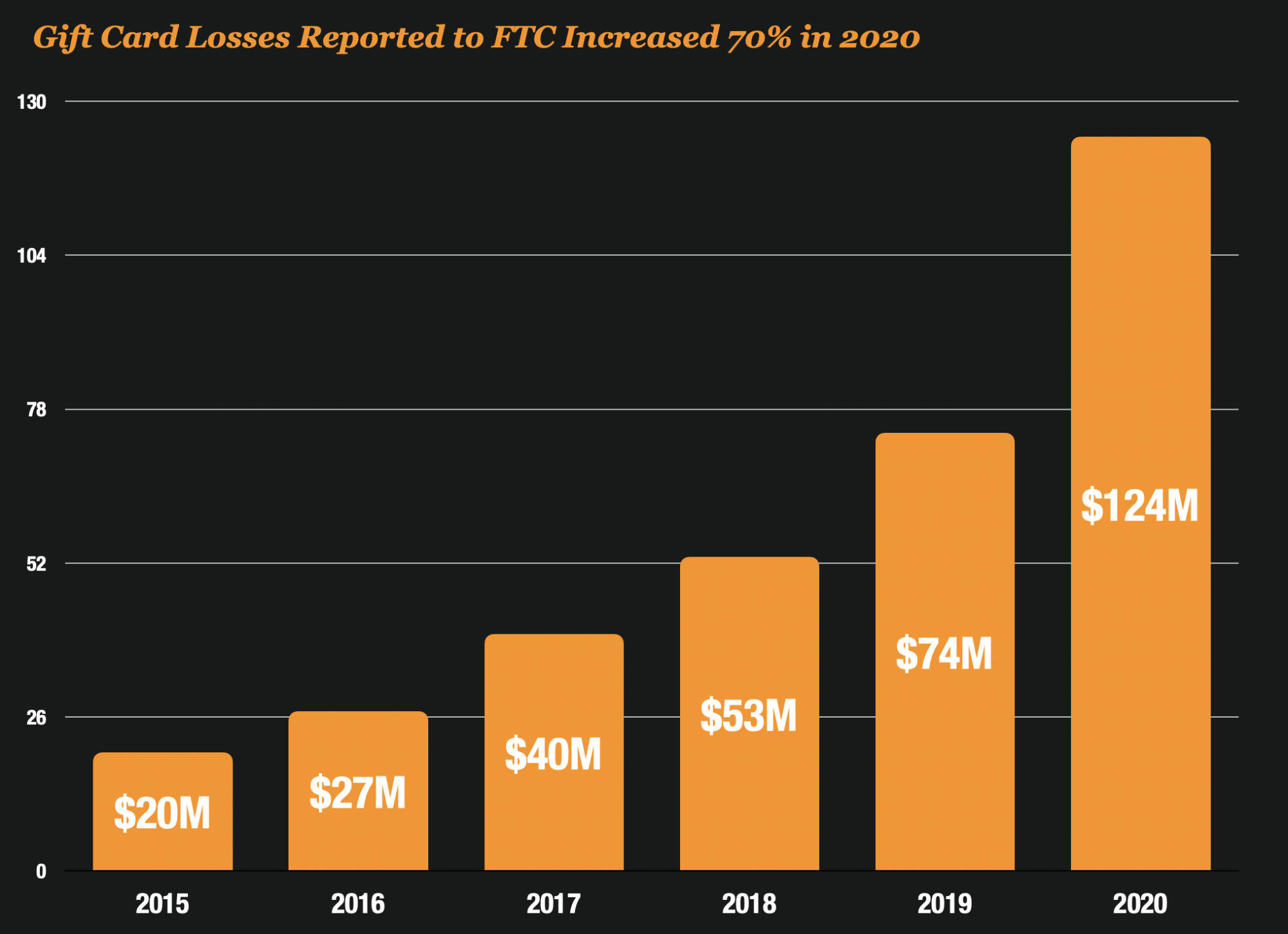 The FTC which released their Fraud Sentinel Report a few weeks ago had similar findings. They saw a significant spike in reported Gift Card Fraud losses last year by over 70% to $124 million for the year.