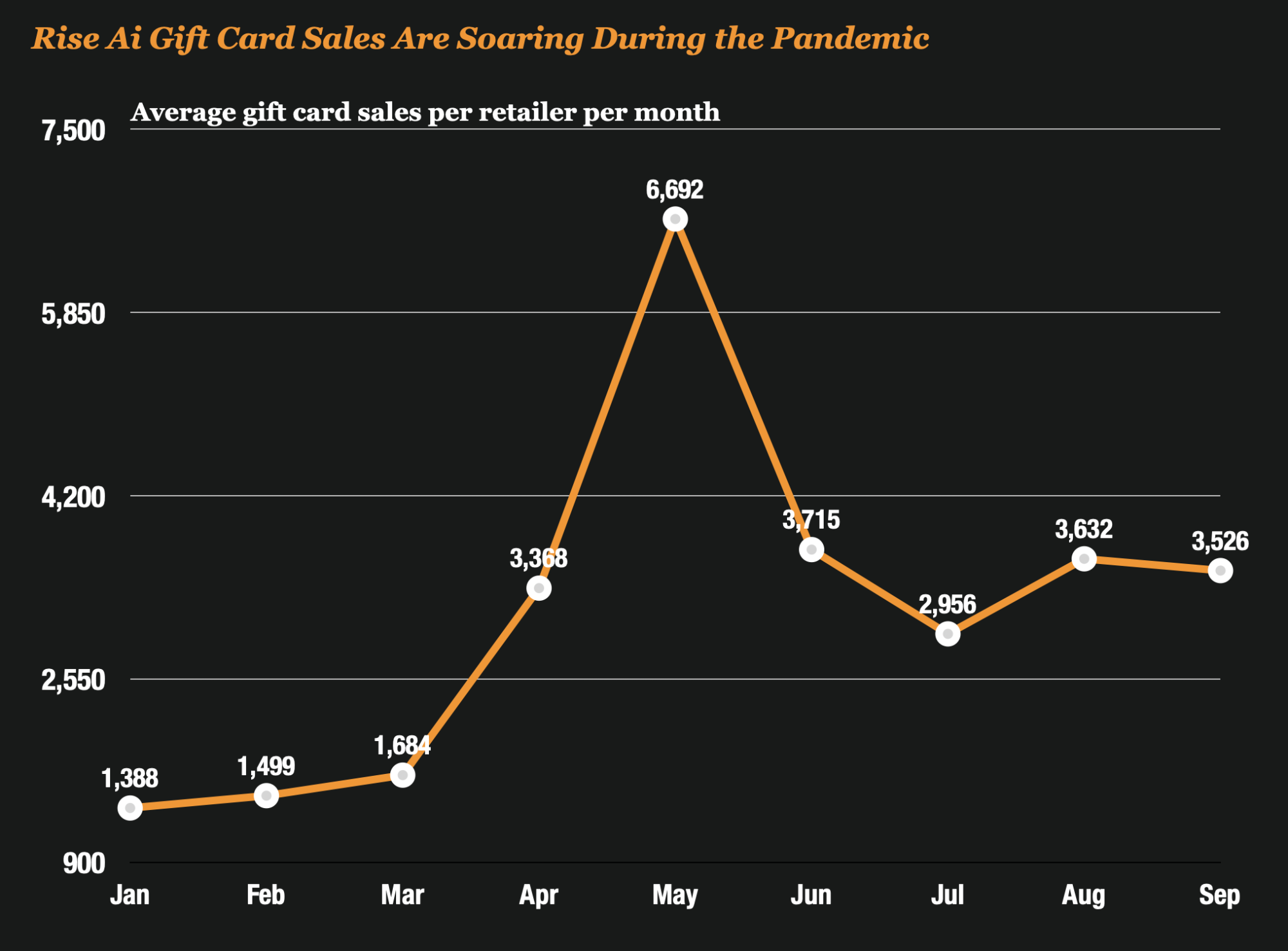 The pandemic brought out the best in people and giving was in full force. Rise.AI tracked the meteoric rise in gift card sales across retailers and found 114% more digital gift cards in the third quarter of 2020 compared with Q3 2019. That according to data from 1,182 U.S. stores that they surveyed.
