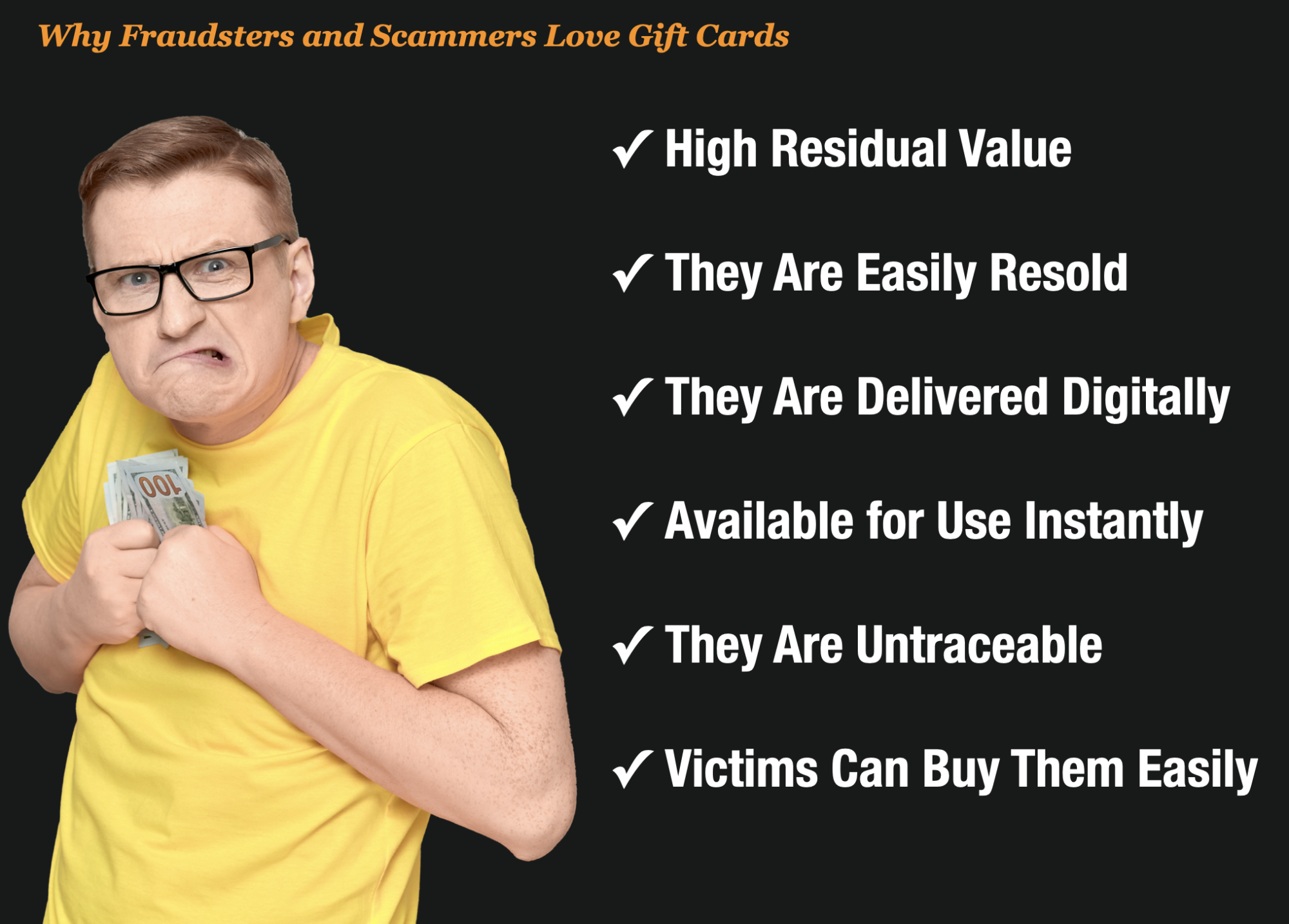 “Gift cards have high residual value so they can be resold for lots of money when the scammers want to cash out.,” she remarked, “And on top of that they can be received by the victim whether they are in the same city or sitting in some internet cafe across the world. They are untraceable and easily transferrable. Gift cards are sought after because they so convenient and convenience always attracts fraudsters.”