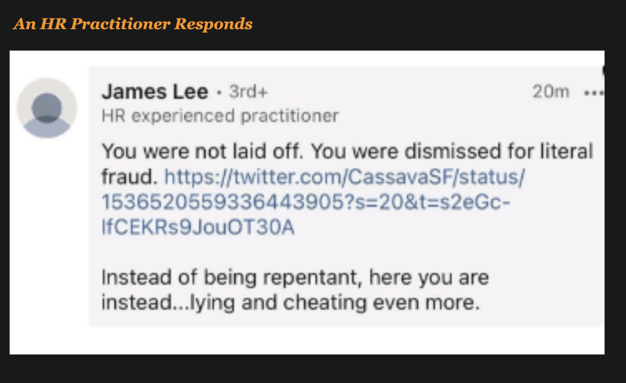 One HR practitioner posted a reply to her post “You were not laid off; you were dismissed for literal fraud. Instead of being repentant, here you are instead lying and cheating even more.”