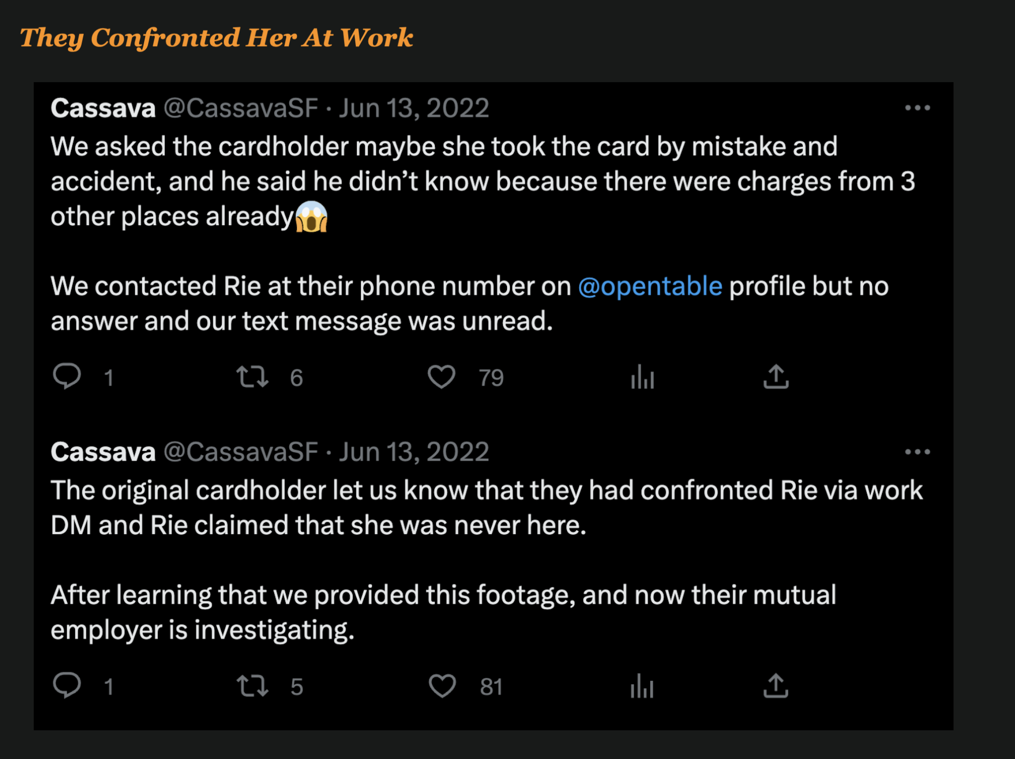 It turns out, he was not wrong. In fact, one restaurant called Cassava in San Francisco had posted that the employee had made a reservation for 6 people using a stolen credit card way back in June of 2022. They racked up a bill for $425.14 and stiffed the restaurant.