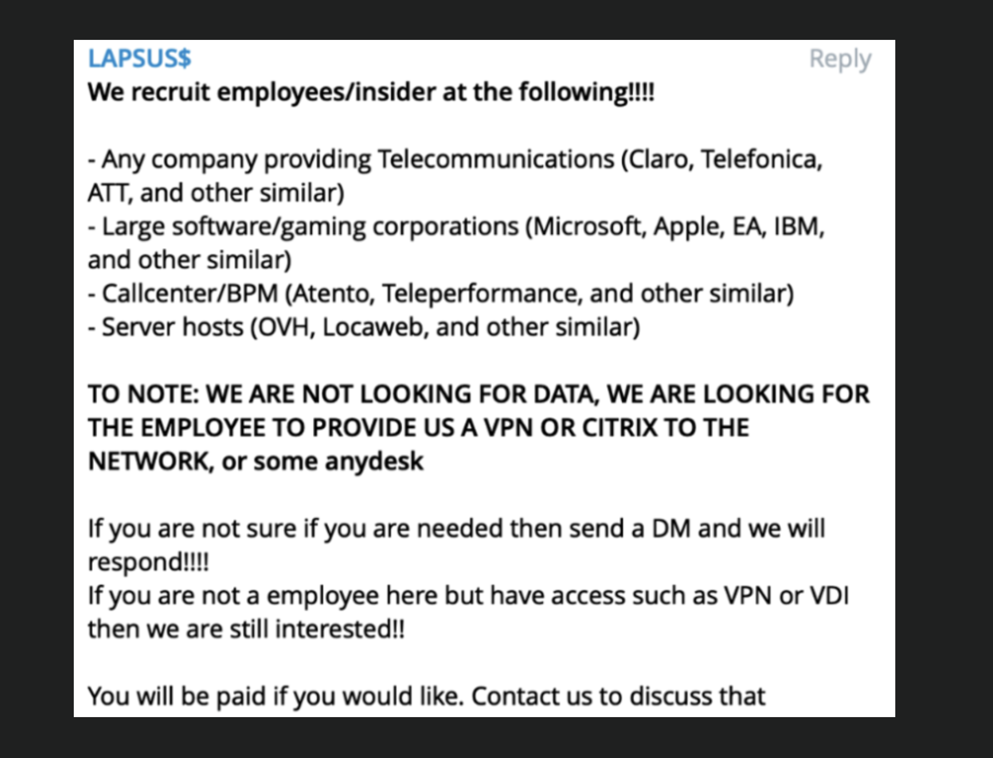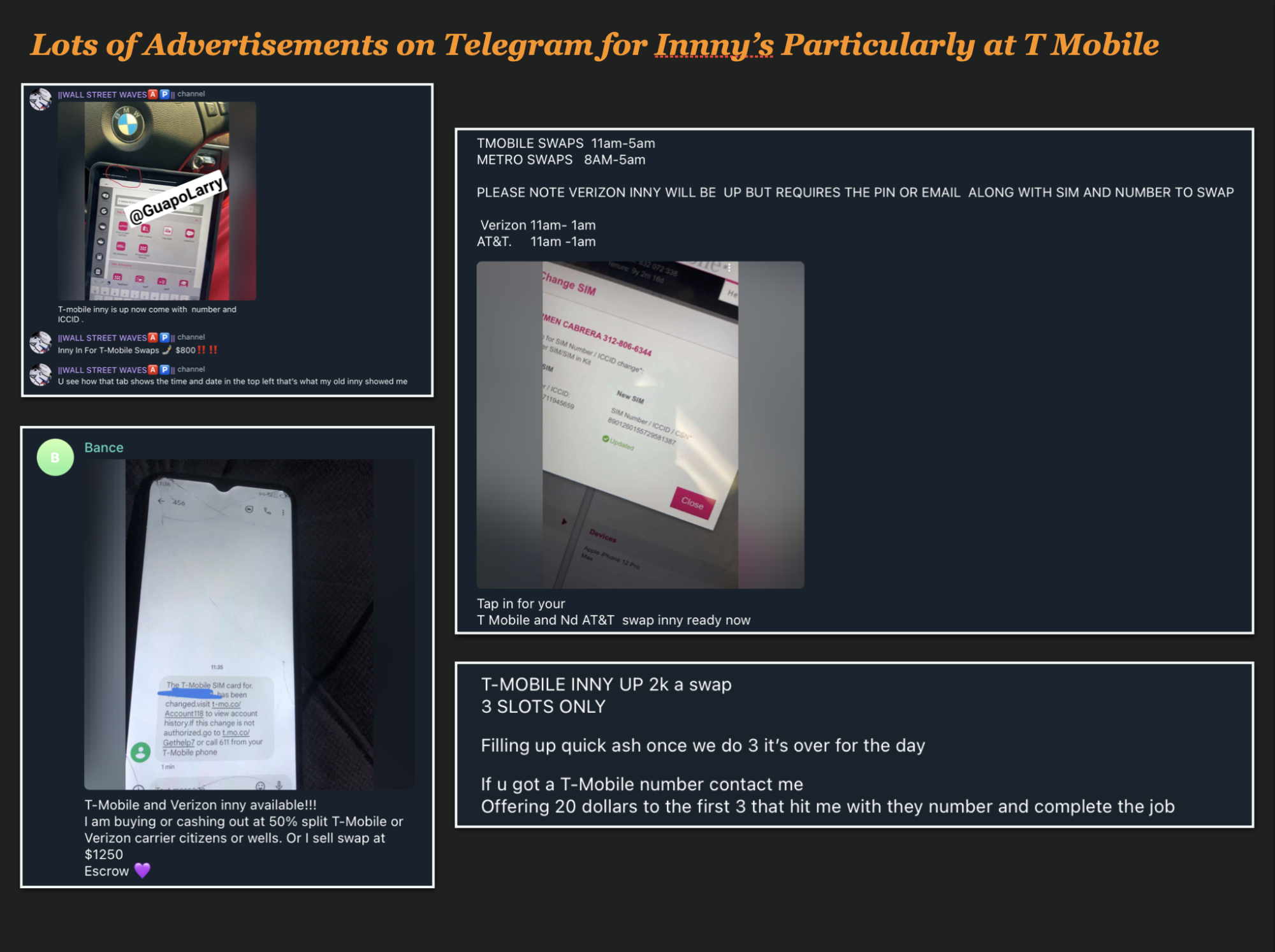 They even advertised on Telegram, recruiting industry insiders to provide access to their systems which would give them unlimited access to Sim Swap phones