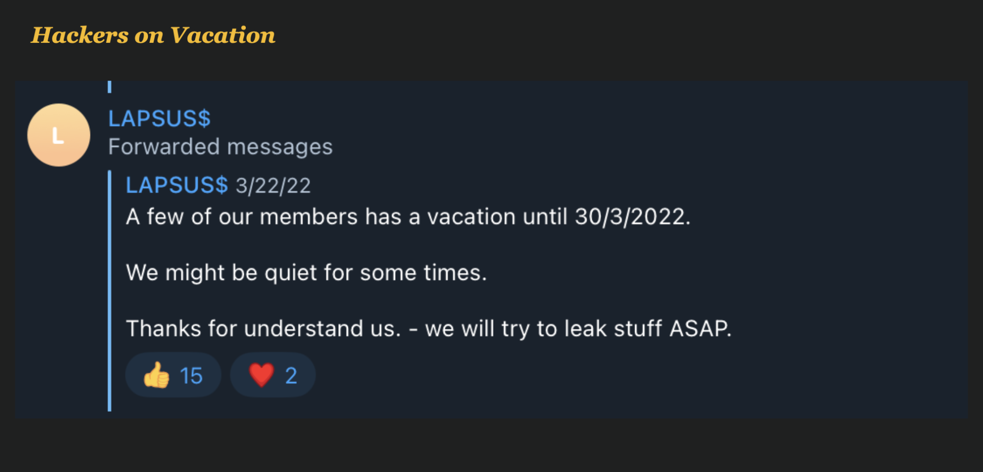 After those arrest, the hackers Telegram Channel indicated that several members of the team had gone on vacation.