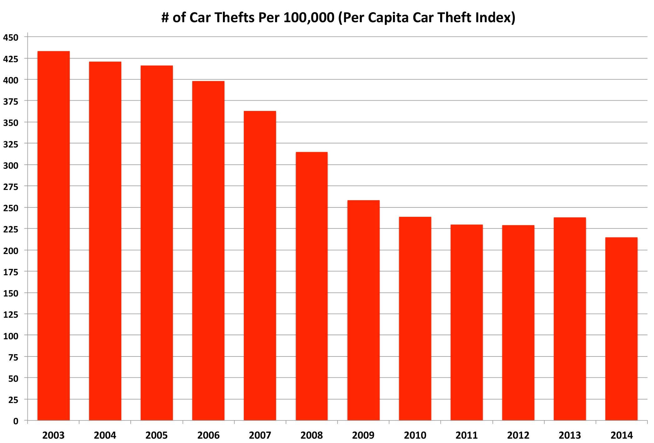 Thefts of cars have gone on a decades-long decline here in the United States. In 2003, there were more than 433 car thefts per 100,000 people. Today, the number of thefts has dropped to 215. That is a reduction in car thefts by over 50%!