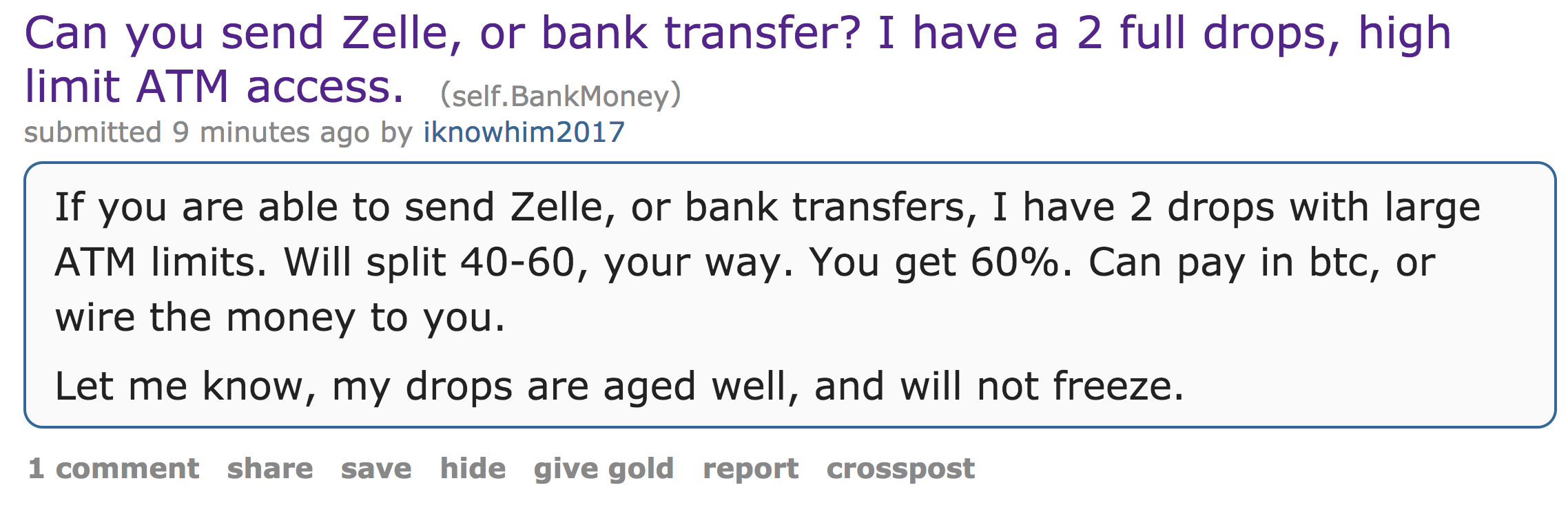 The messages appear to indicate that fraudsters are looking for “bank drops” which are accounts that are opened with fraudulent credentials. These bank drops enable the fraudsters to receive money from stolen accounts. They essentially act as mule accounts which can be used by fraudsters to gain access to funds.