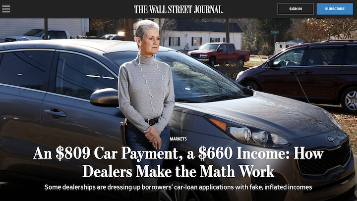 An article in the Wall Street Journal was published which indicated that 1 in 5 borrower applications have inflated incomes. The article written by Ben Eisen exposes some dealers that lie about the income to get loans approved and put the borrowers in cars that they could not otherwise afford.