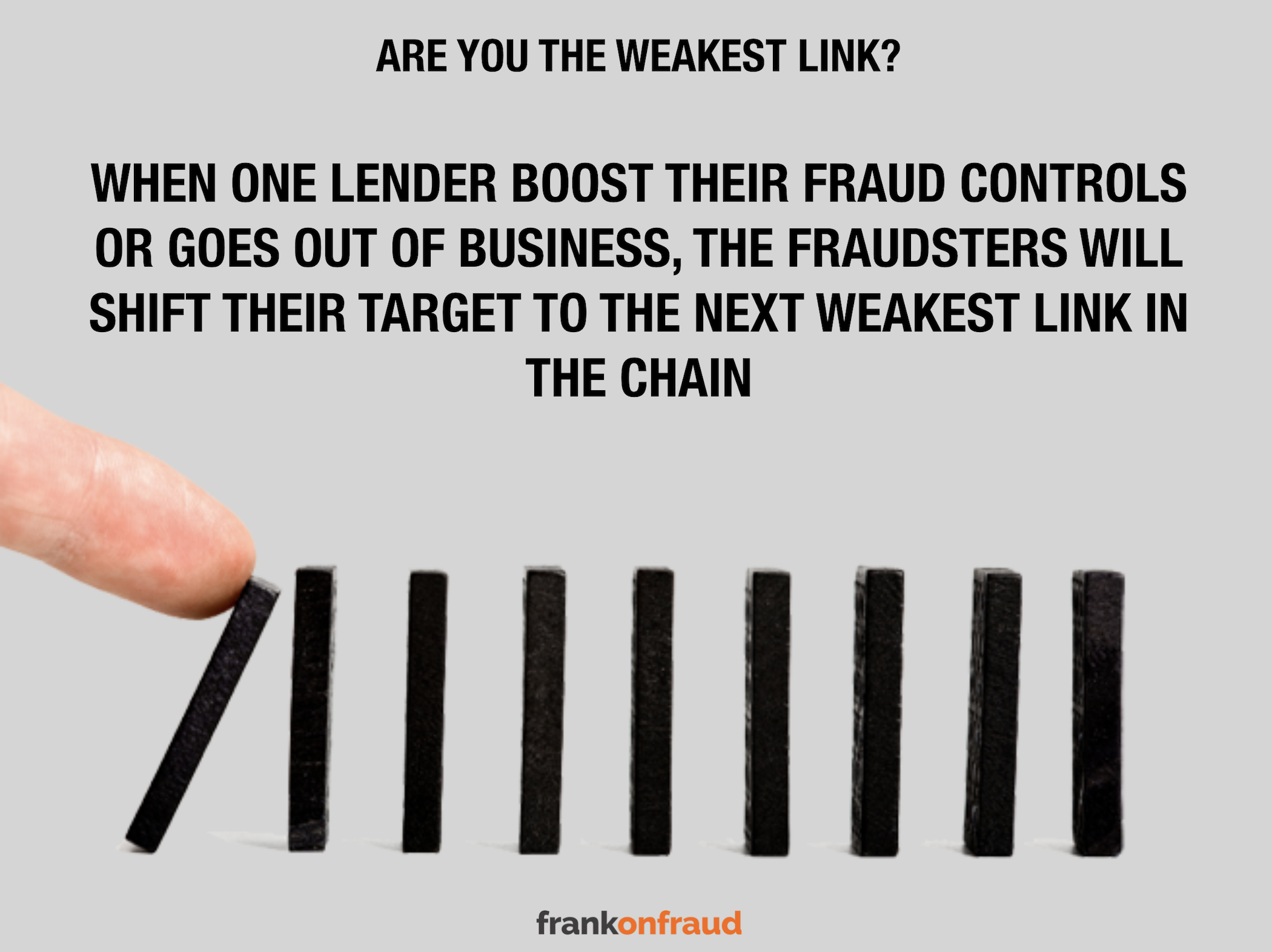 Do not let other lenders’ weak fraud strategy be your fraud strategy. Just because someone’s weak fraud controls has kept your losses artificially low does not mean your exposure to fraud is minimal.