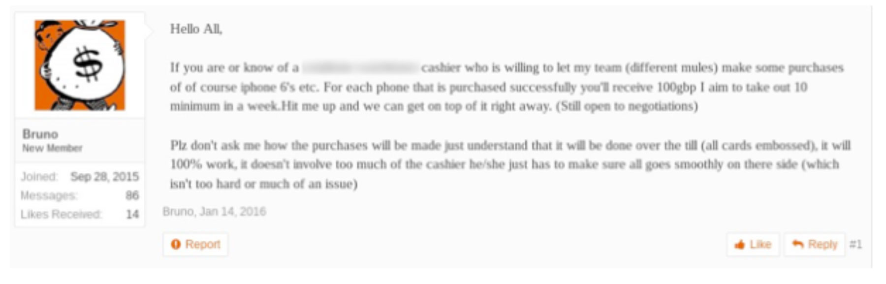 Below is an example from Red Owl of the type of posts that they are seeing on the dark web to recruit insiders.