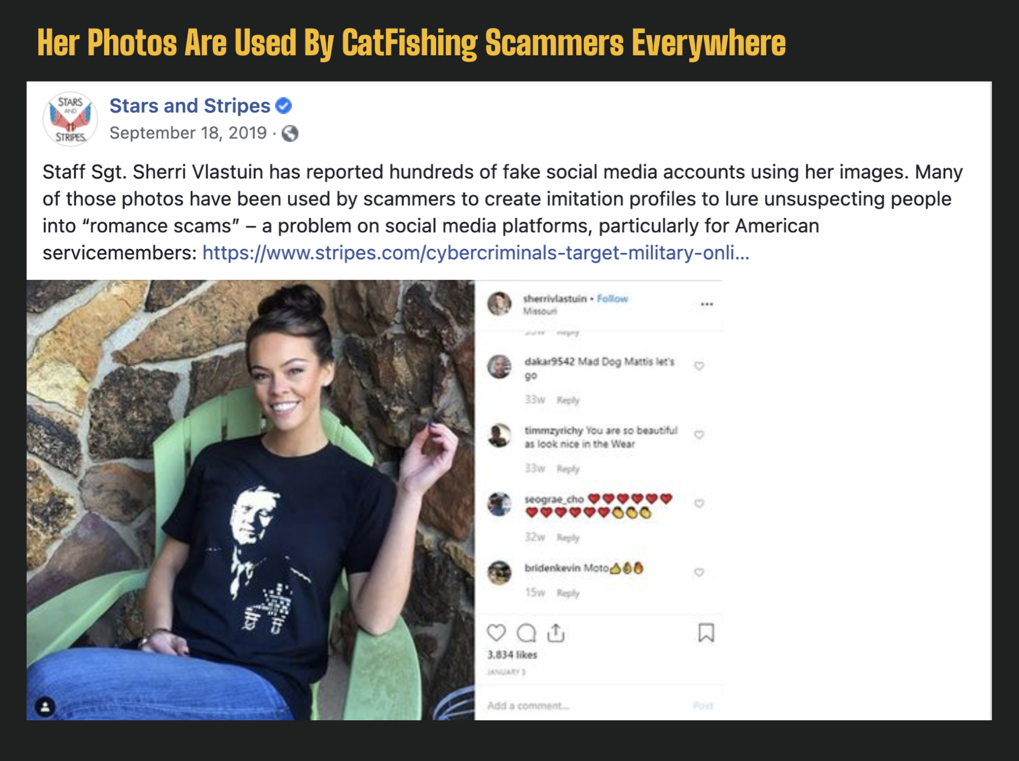 Staff Sgt Sherri Vlastuin isn’t a scammer, but her photos are used by scammers all over the world to bilk innocent people in low-level romance scams.
