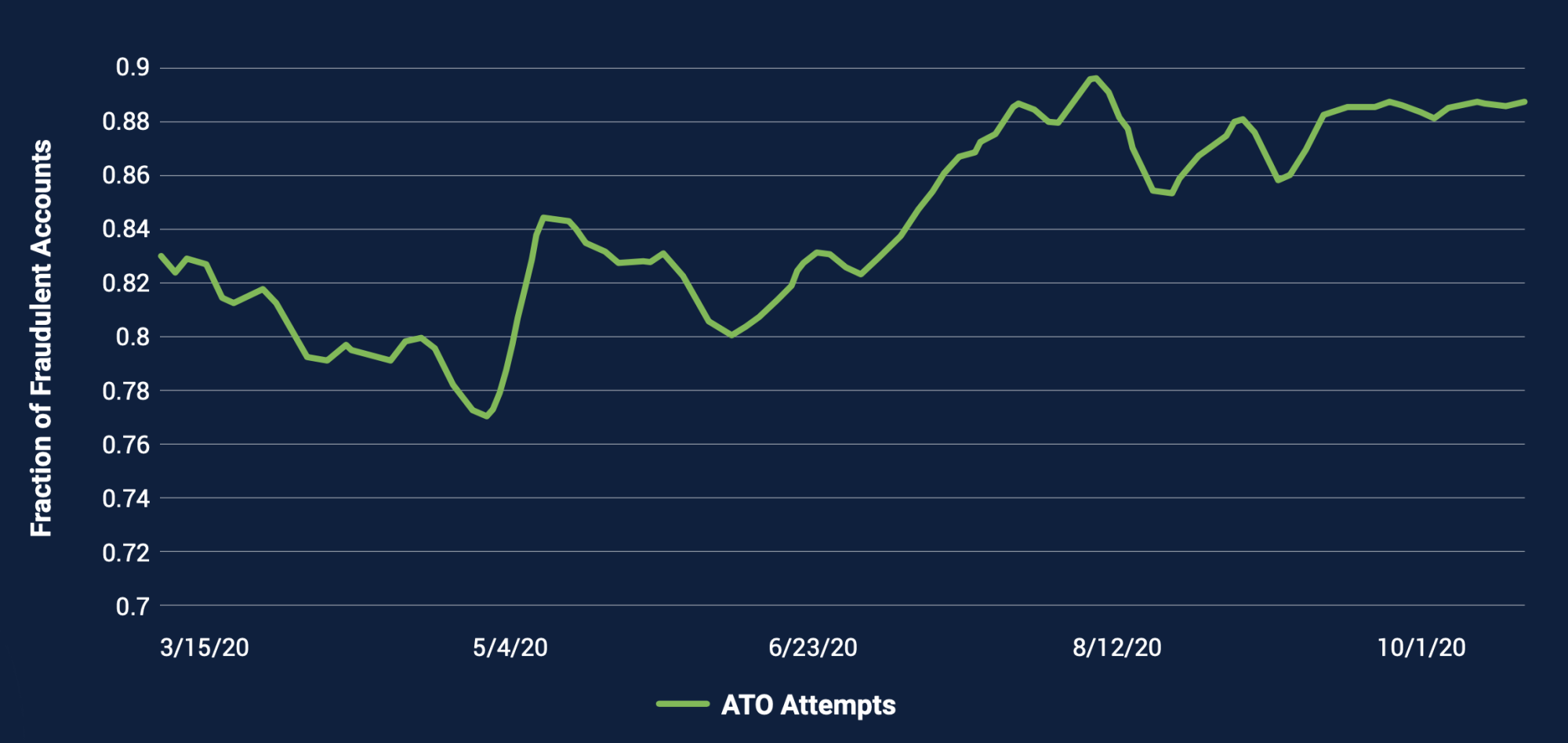 DataVisor analyzed 128 billion online transactions from over 2 billion users in 2020 and discovered that account takeover is the most common attack – comprising 70%- 90% of fraud attacks. Account takeovers grew over 2020 as the pandemic raged.