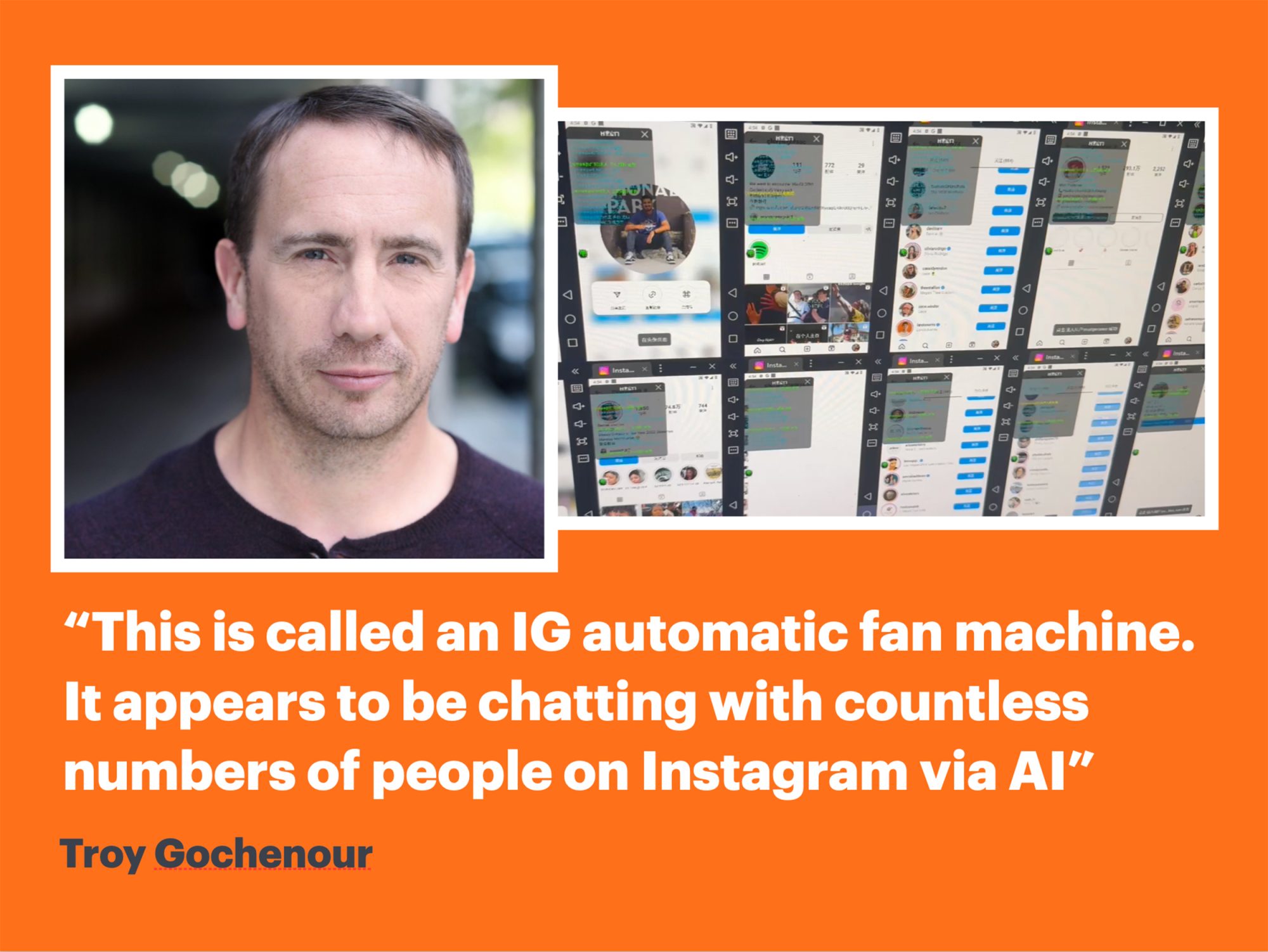 While diving deep into the murky underworld of Chinese language fraud channels on Telegram, he stumbled upon videos of what appears to be a cluster of iPhones automatically chatting with a “countless number of people on Instagram.”