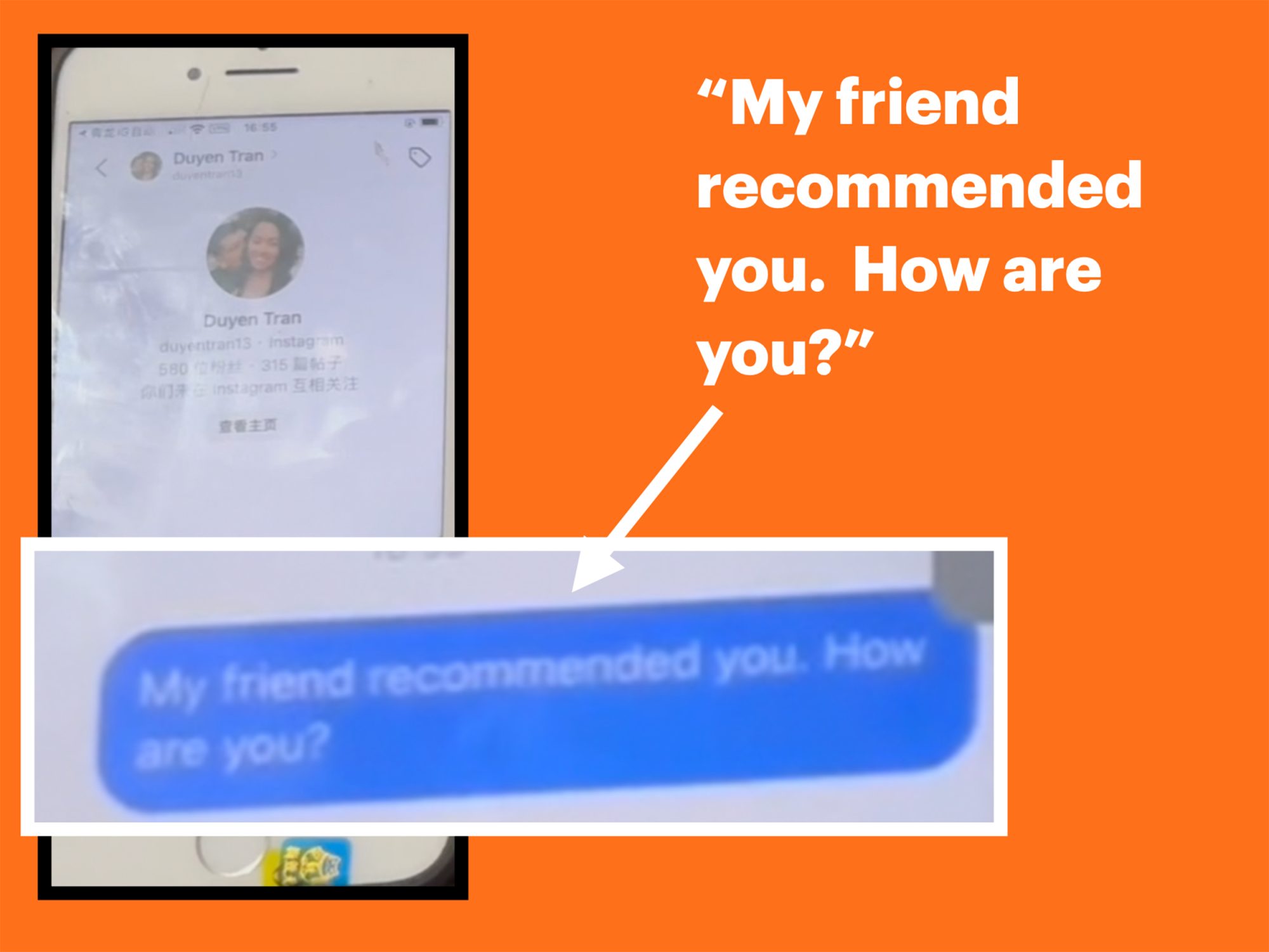 Yet another, named “Duyen”, reaches out to a victim: “My friend recommended you. How are you?”