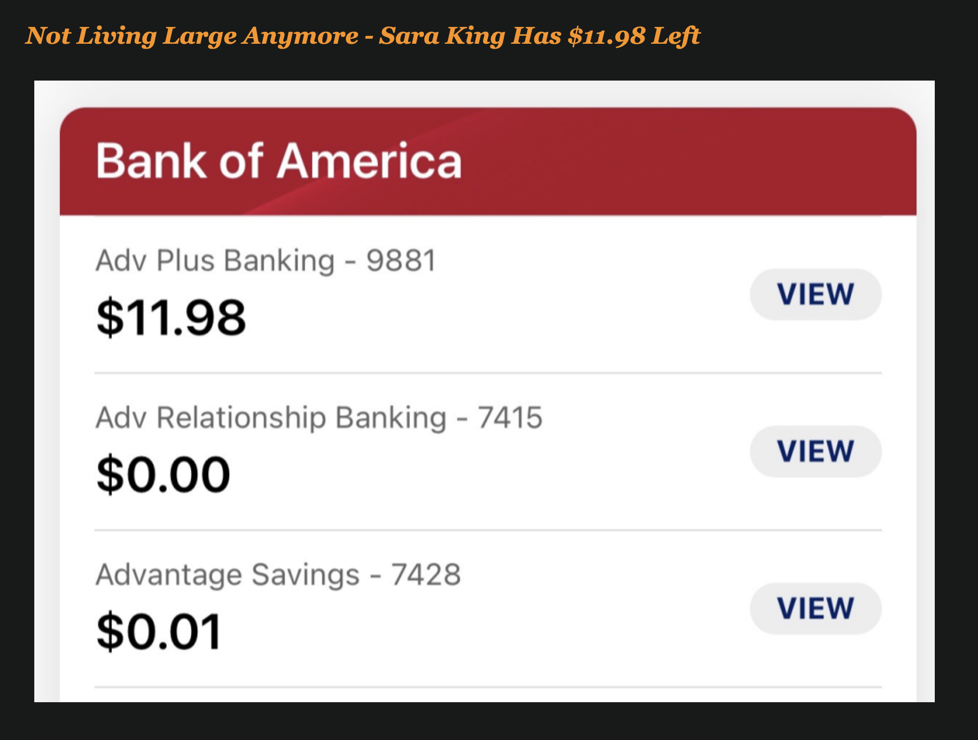 Sara King is allegedly now near broke. In the lawsuit, they provide screen shots of her Bank of America account where she now claims to have only $11.98 in her name.