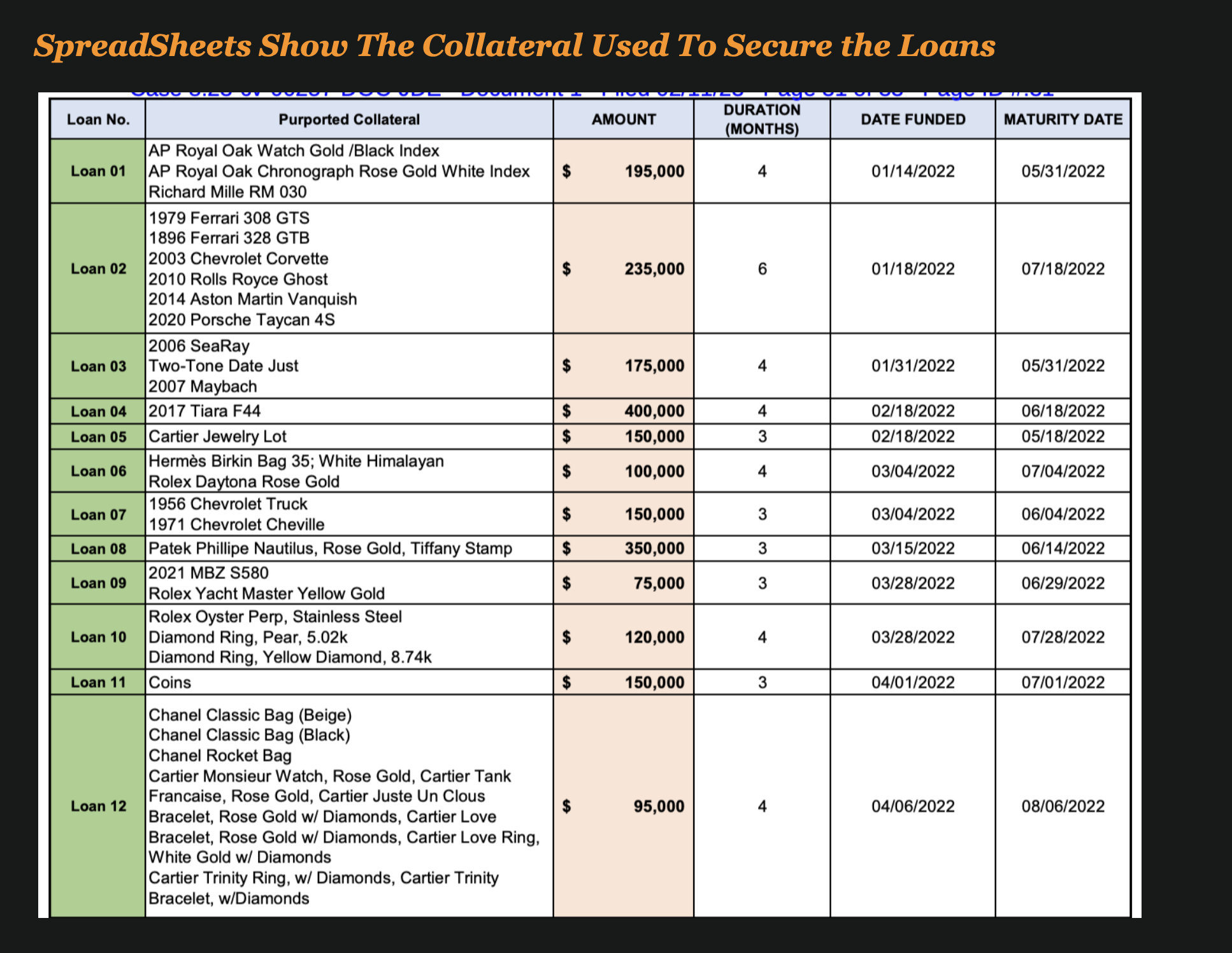 “The purported loans from King Lending to the third-party borrowers were purportedly secured by various forms of collateral, including but not limited to luxury automobiles, boats, yachts, jewelry, watches, precious metal coins, and the earnings from guaranteed professional sports contracts”
