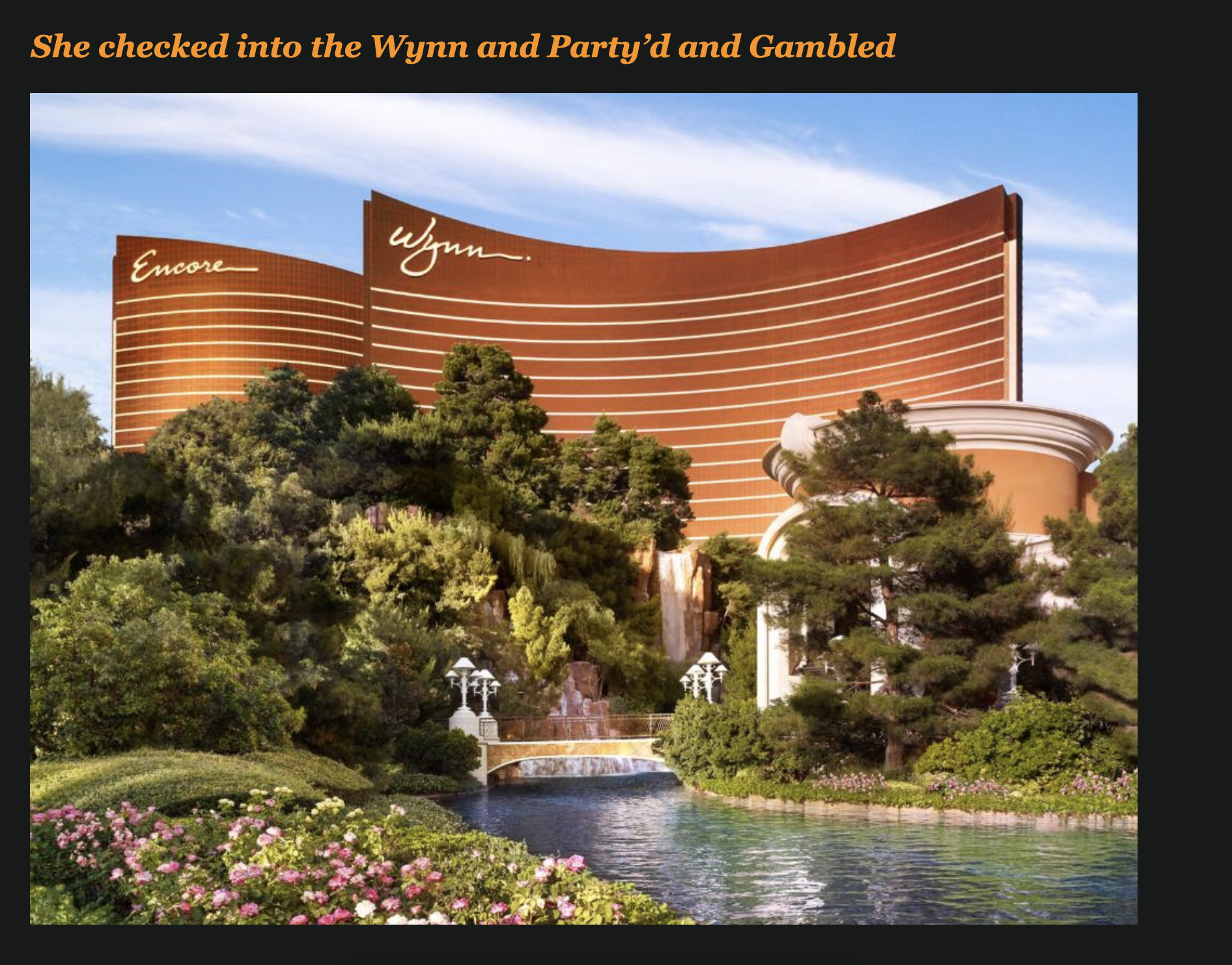 Instead, she checked into the Wynn Casino in Vegas and wasted the money on partying and gambling.