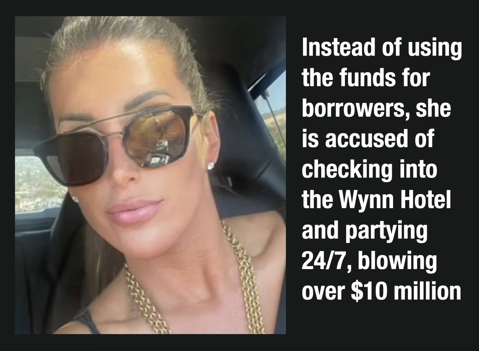 To collateralize the loans, she allegedly mislead the lenders. She provided documentation from borrowers that showed they were putting up expensive luxury items to secure the loans.
