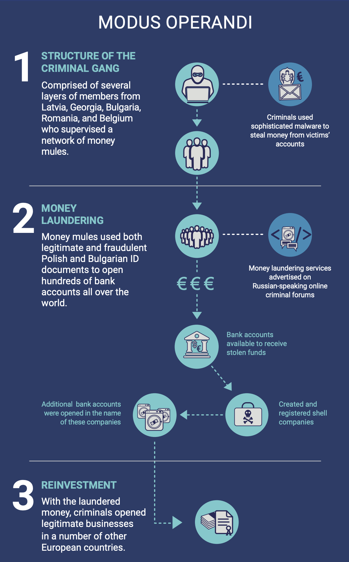 Comprised of several layers of members from Latvia, Georgia, Bulgaria, Romania, and Belgium, among other countries, the QQAAZZ network opened and maintained hundreds of corporate and personal bank accounts at financial institutions throughout the world to receive money from cybercriminals who stole it from bank accounts of victims. The funds were then transferred to other QQAAZZ-controlled bank accounts and sometimes converted to cryptocurrency using “tumbling” services designed to hide the original source of the funds. After taking a fee of up to 40 to 50 percent, QQAAZZ returned the balance of the stolen funds to their cybercriminal clientele.