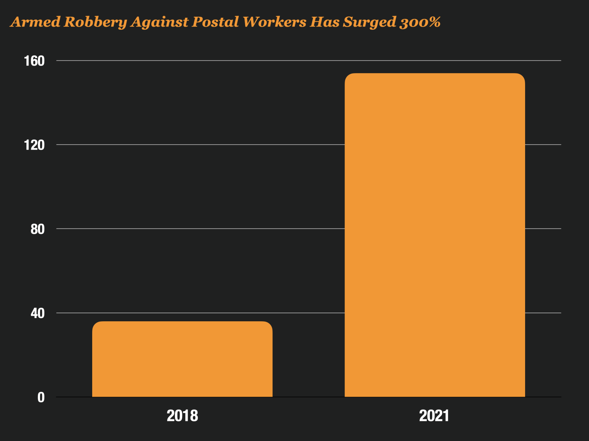 The number of letter carrier robberies across the country rose from 80 in 2018 to 261 in 2021. The number of armed robberies jumped from 36 in 2018 to 154 in 2021, according to the data.