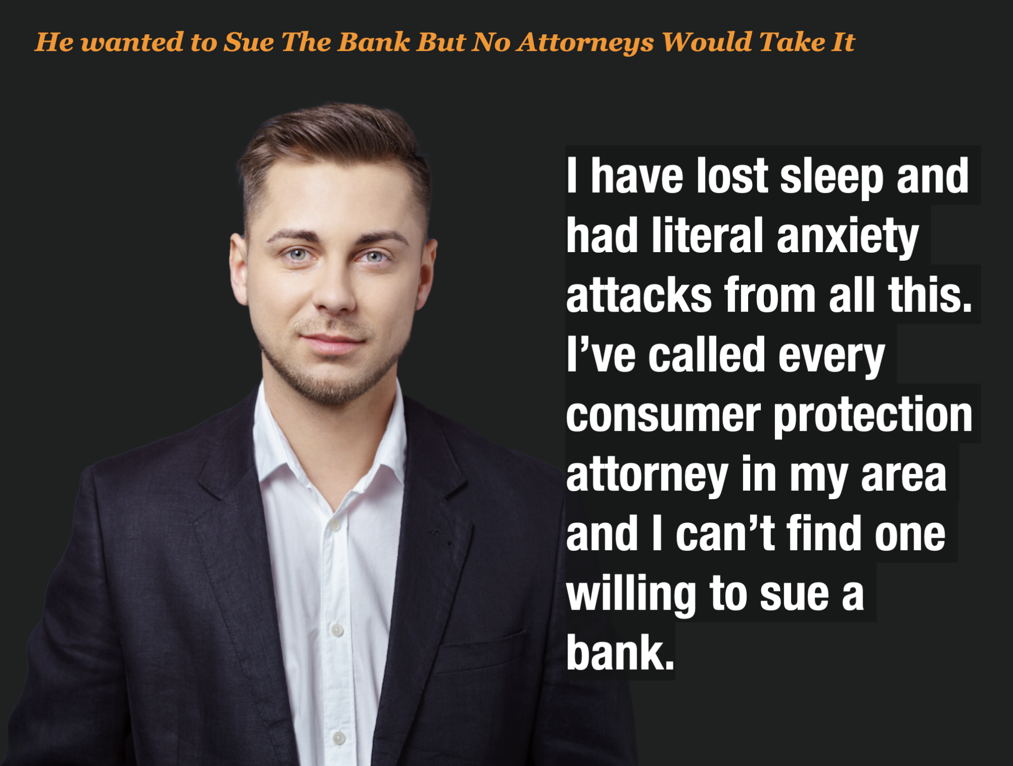“I have lost sleep and had literal anxiety attacks from all this. I’ve called every consumer protection attorney in my area and I can’t find one willing to sue a bank.”