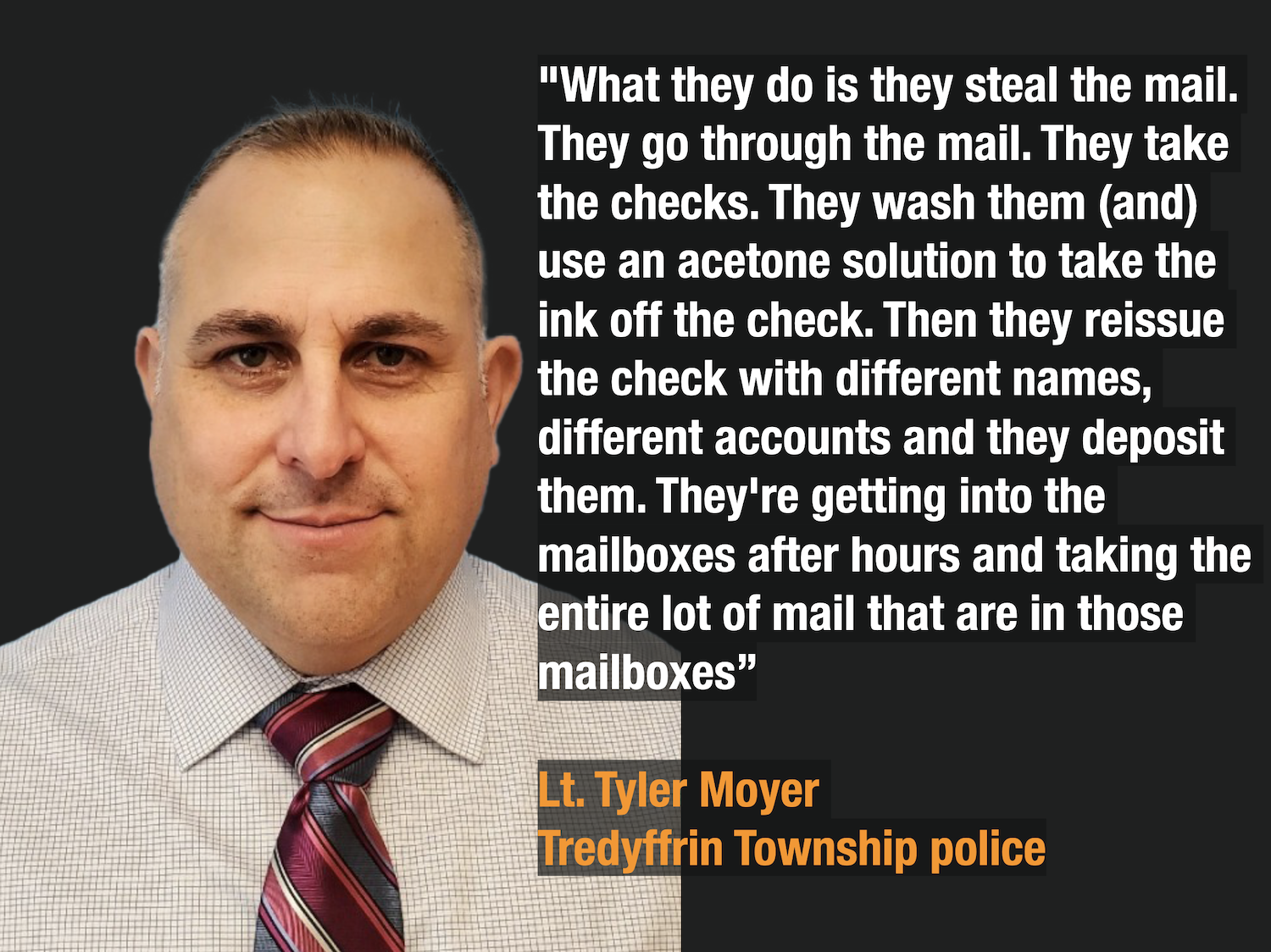 Lt. Tyler Moyer with the Tredyffrin Township police outlined how they run the scam. “What they do is they steal the mail. They go through the mail. They take the checks. They wash them (and) use an acetone solution to take the ink off the check. Then they reissue the check with different names, different accounts and they deposit them. They’re getting into the mailboxes after hours and taking the entire lot of mail that are in those mailboxes”