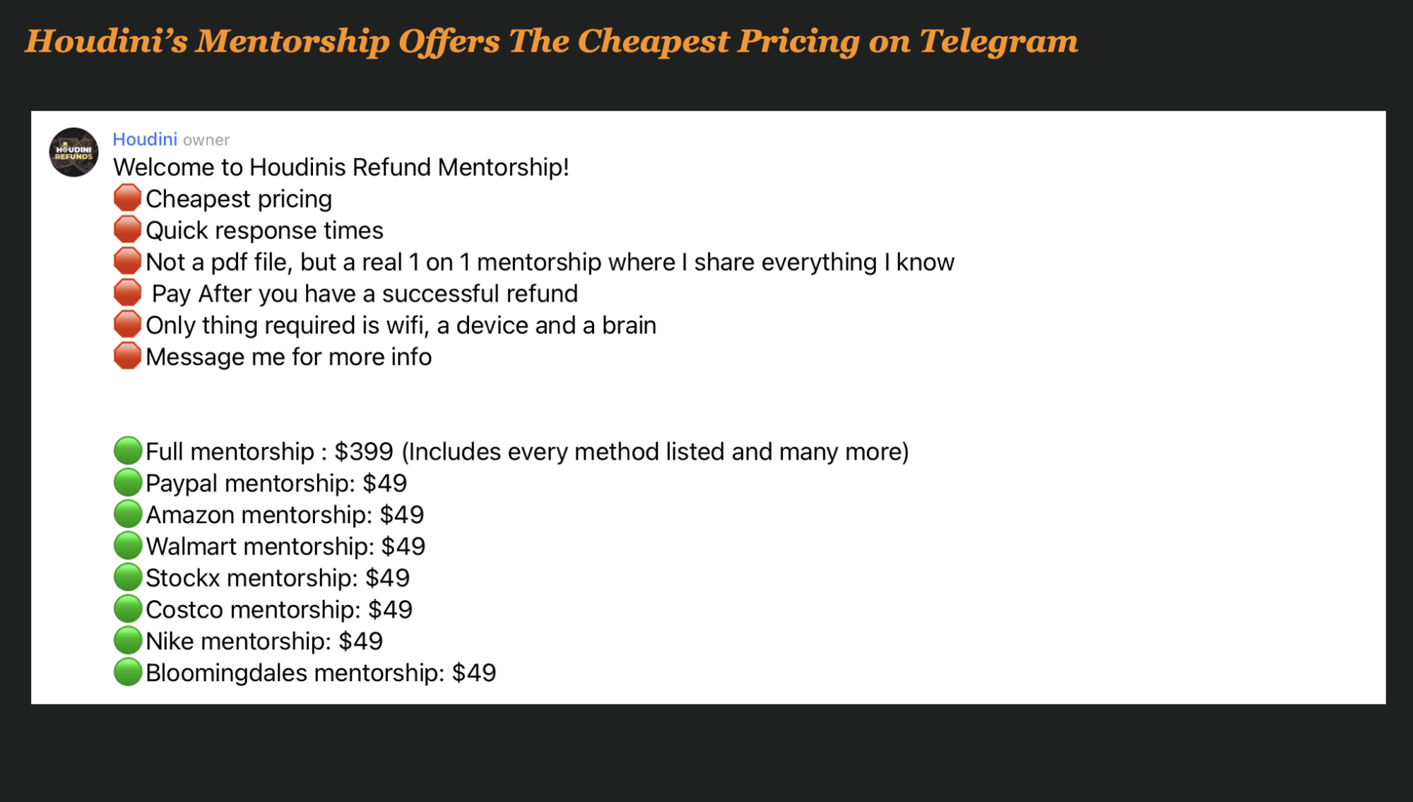Mentoring services have sprouted up all over Telegram, asking “Why Should You Pay Refunders When You Can Do It For Yourself?”