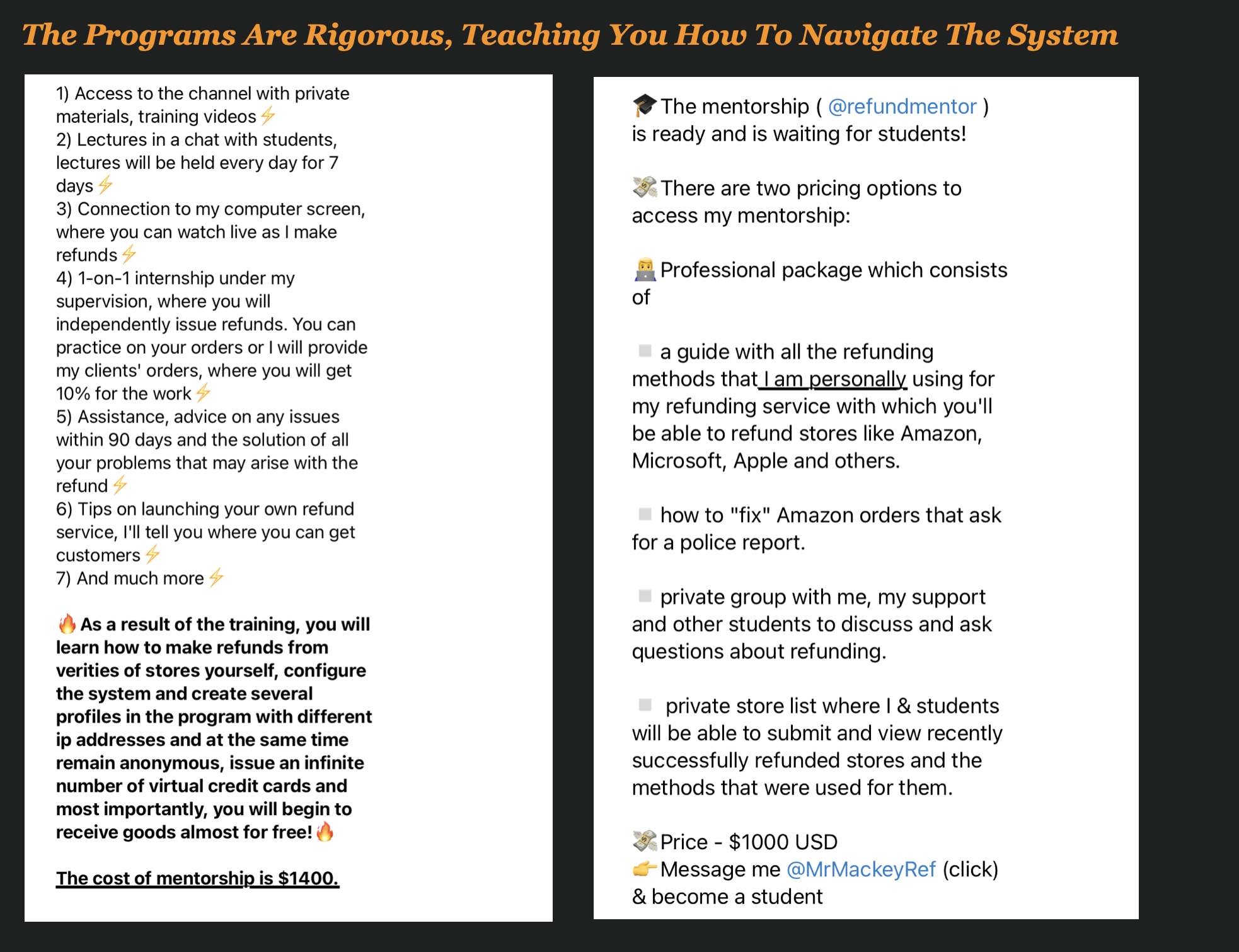The services range from $50 for guides and mentoring on how to defraud a merchant like Amazon to $1,400 for a universal program that helps you defraud any merchant.