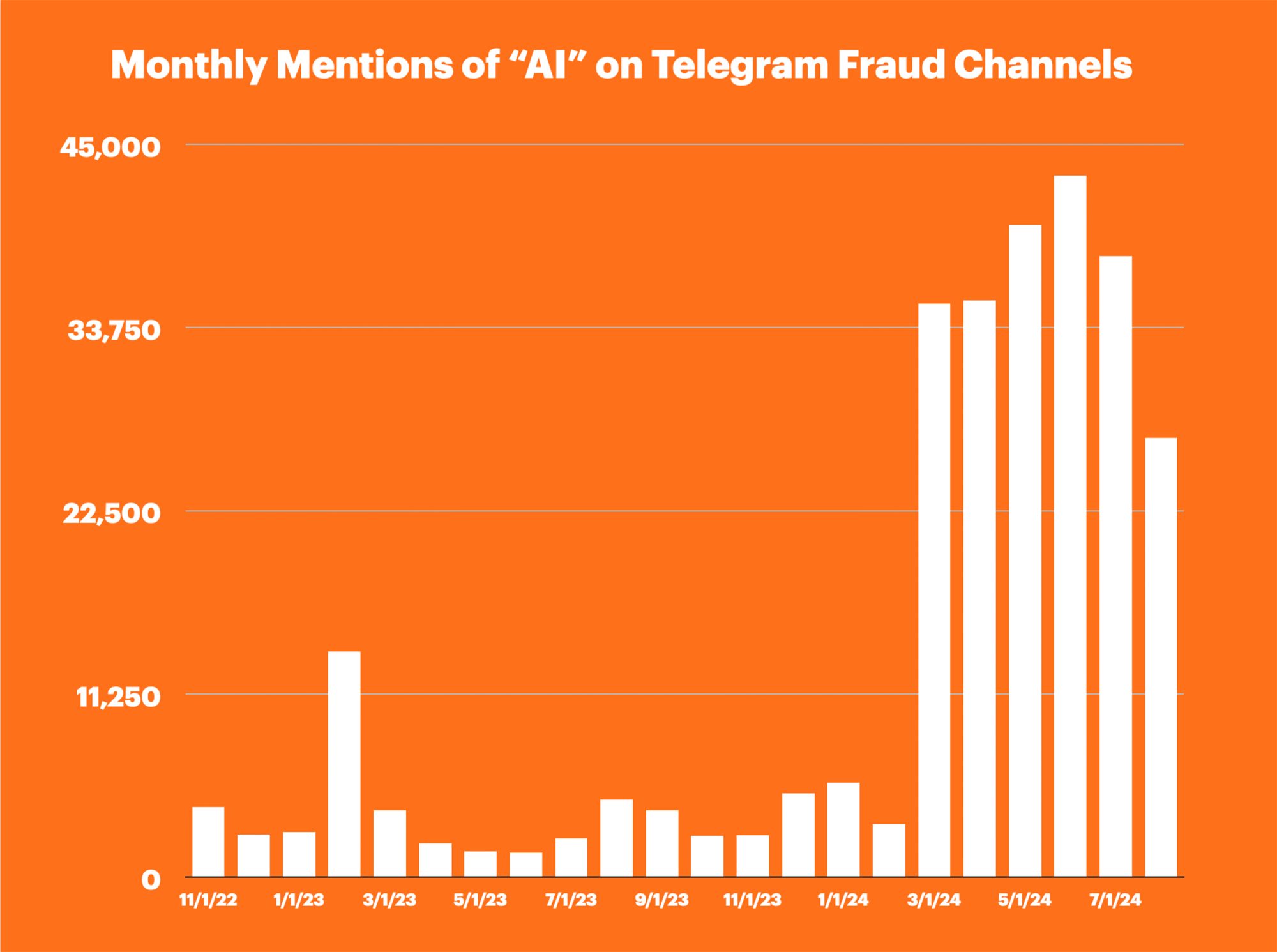 Point Predictive scientists tracked the mention rate of the term AI on Telegram’s top 50 fraud channels and detected an enormous spike in mentions in March of 2024.