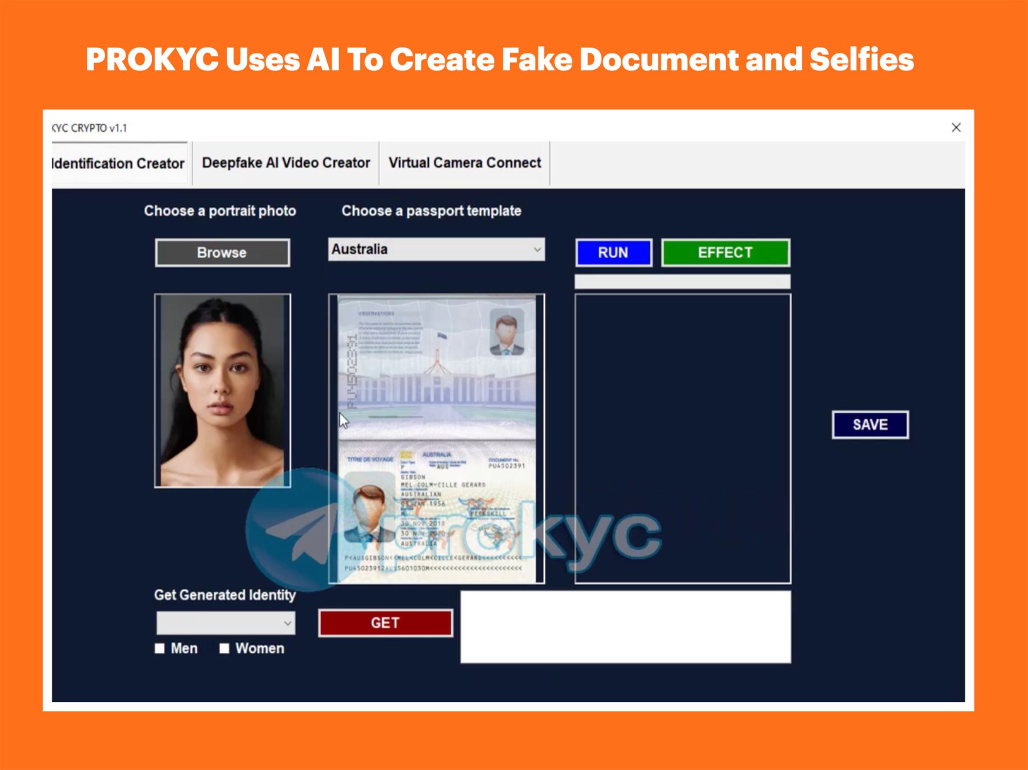 ProKYC is sold primarily on Telegram and dark web channels. The software is unique because it does two things.