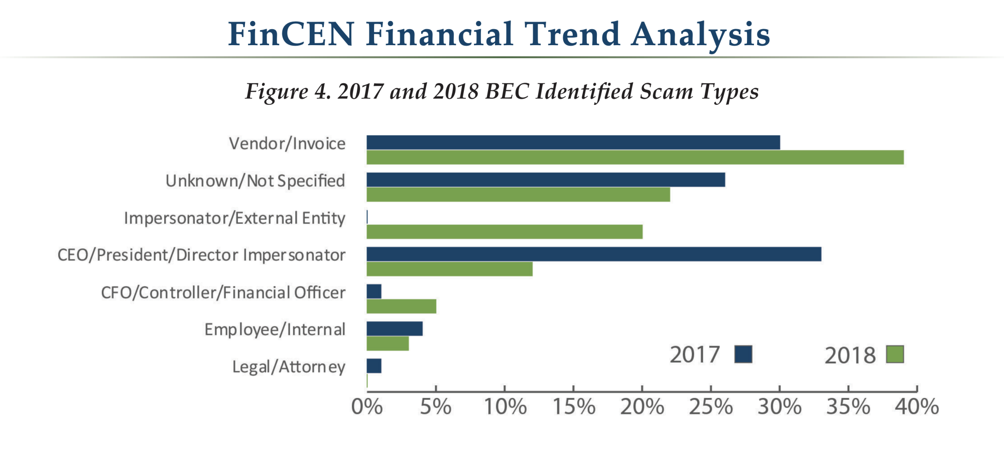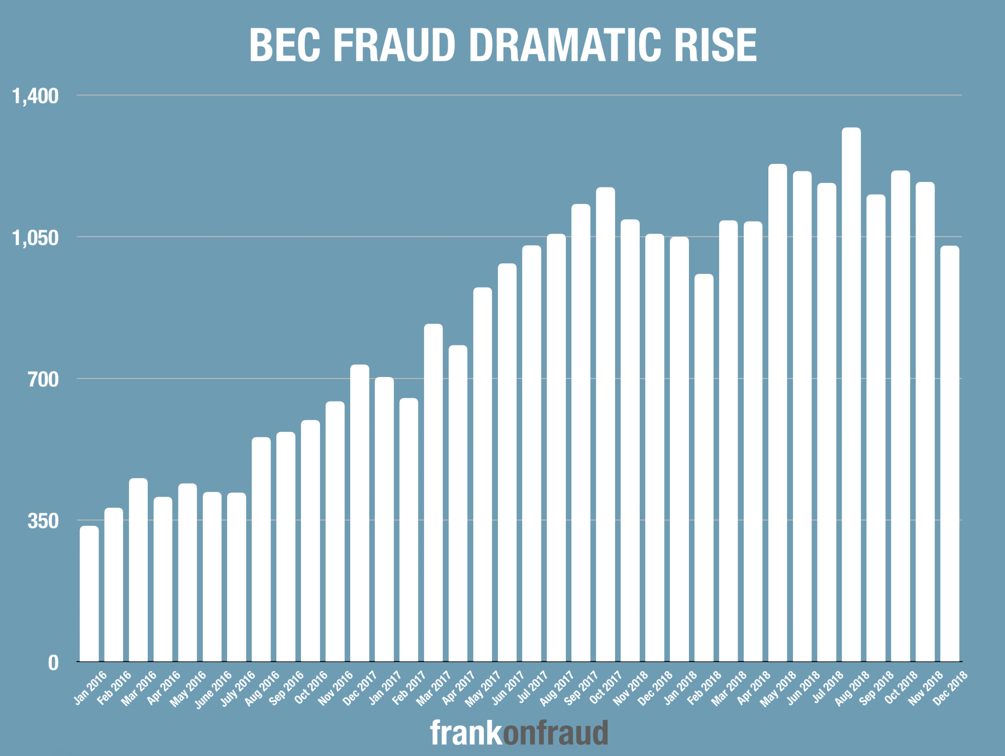 Just as alarming as the losses though was the dramatic increase in FinCEN related SAR Reports which indicate that BEC fraud reports are tripling over the same time period. The average number of SAR’s filed per month increased from 300 in 2016 to over 1,000 in 2018.