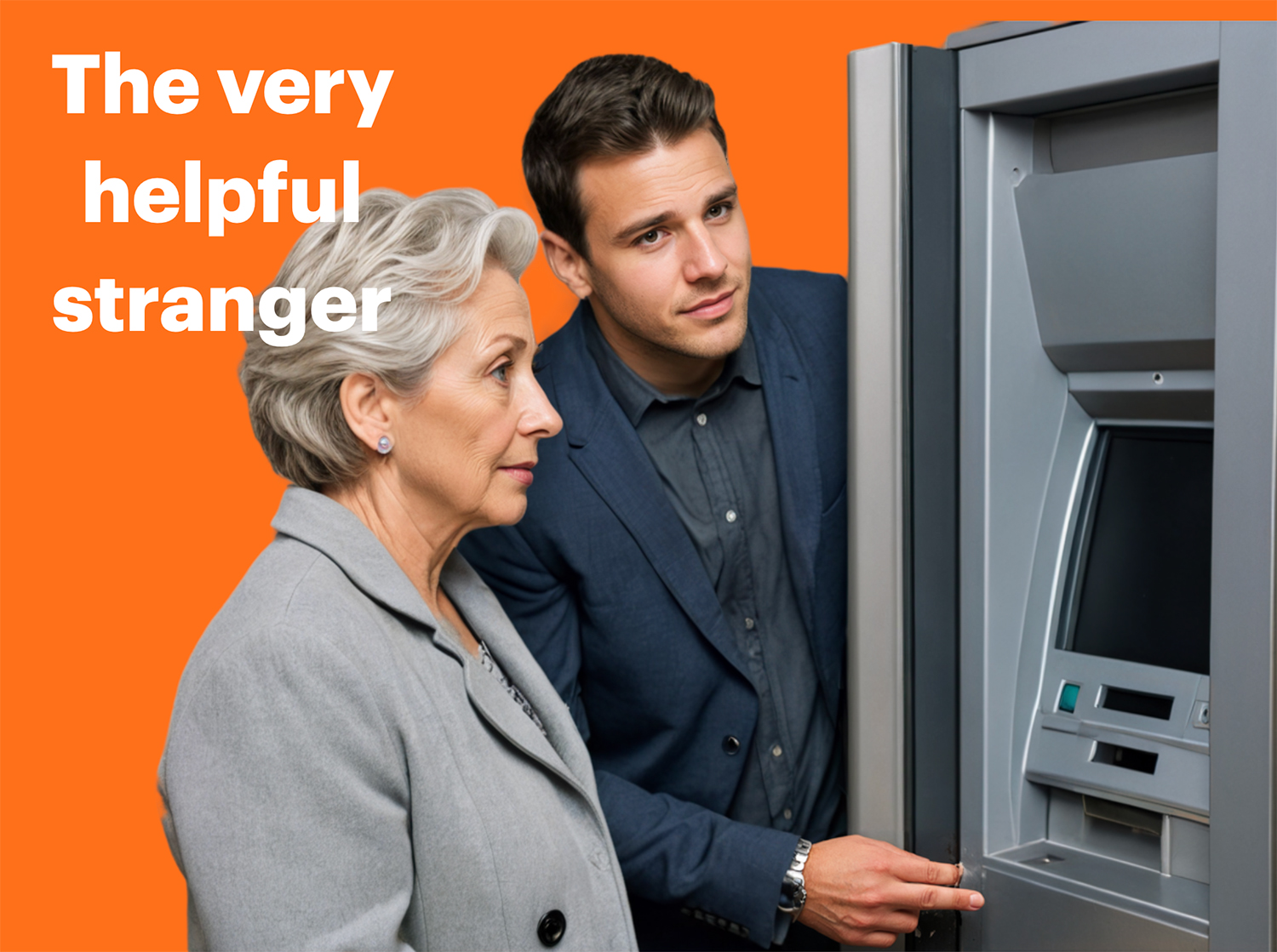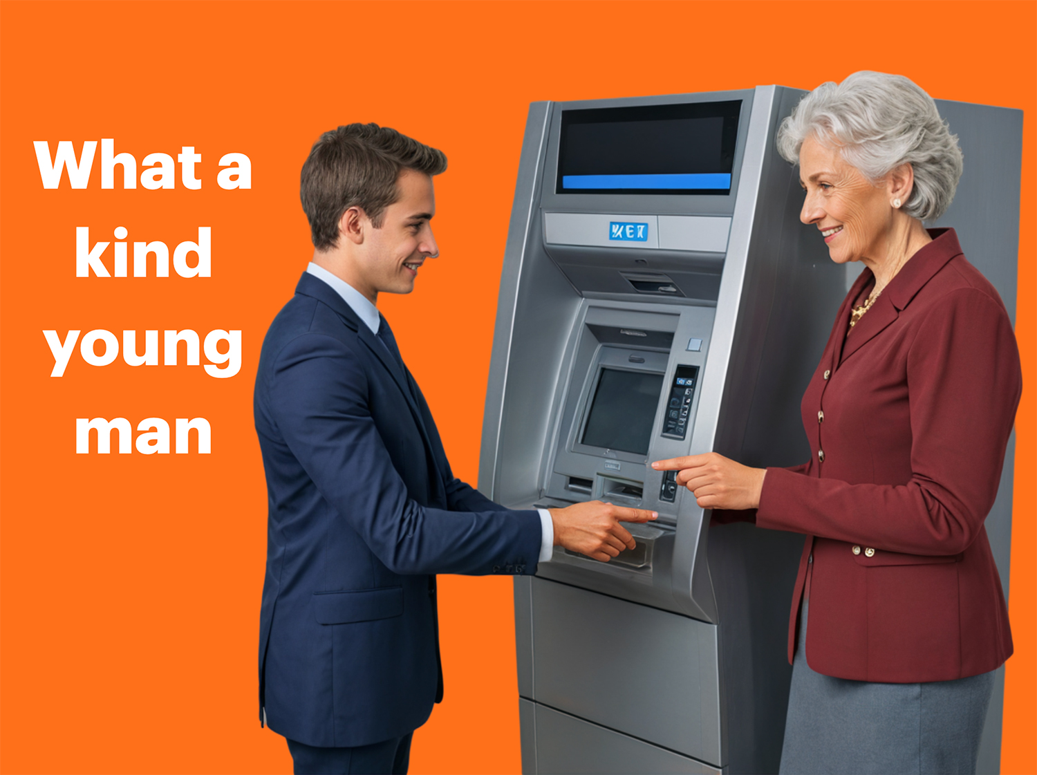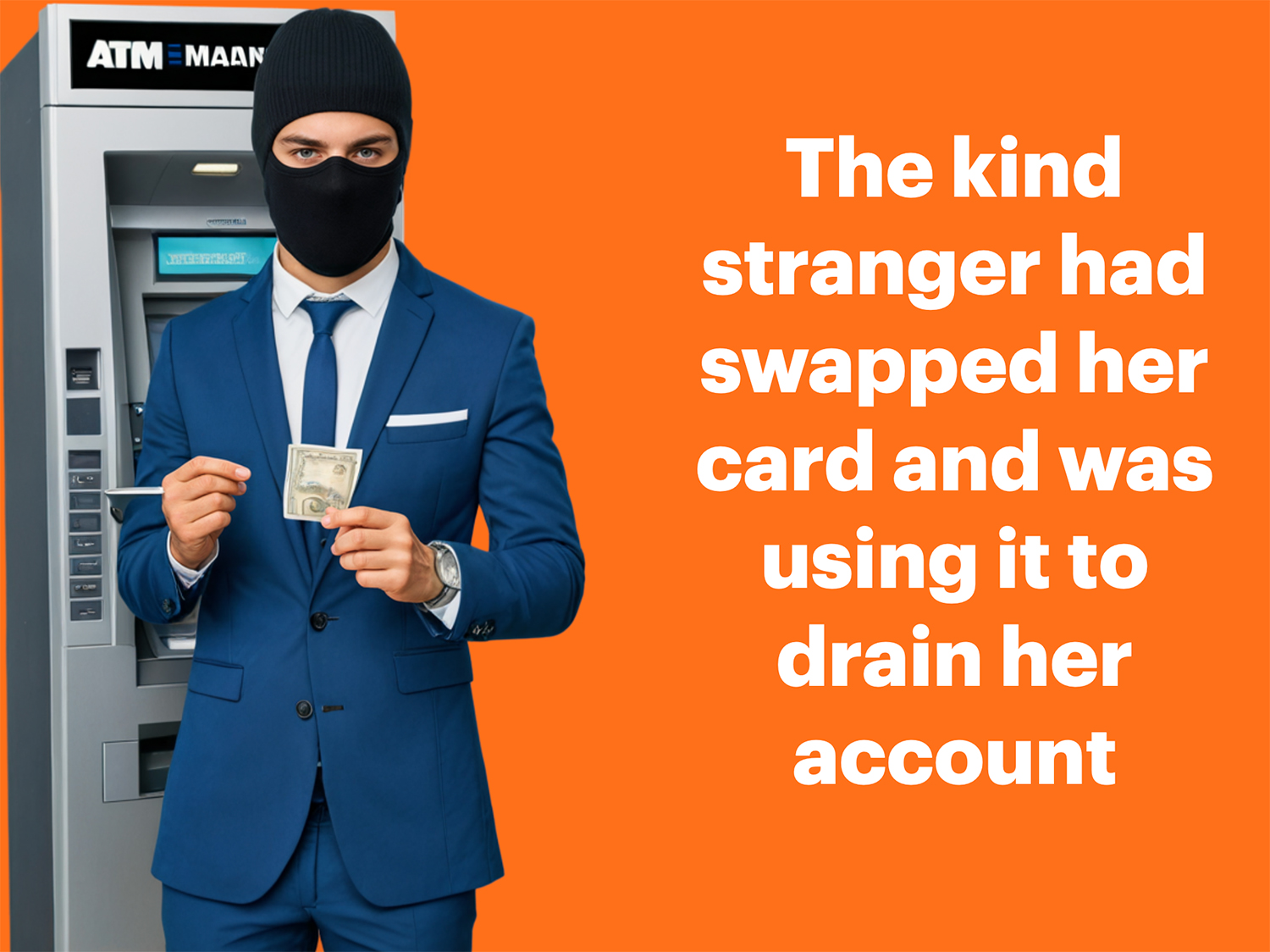 “Let me help you,” the young man said, “it can be tricky.” He reached for her card, and Doris gave it to him. The helpful stranger put her card in the ATM, had her punch in her PIN number. Then he pushed some buttons and gave her the card back.