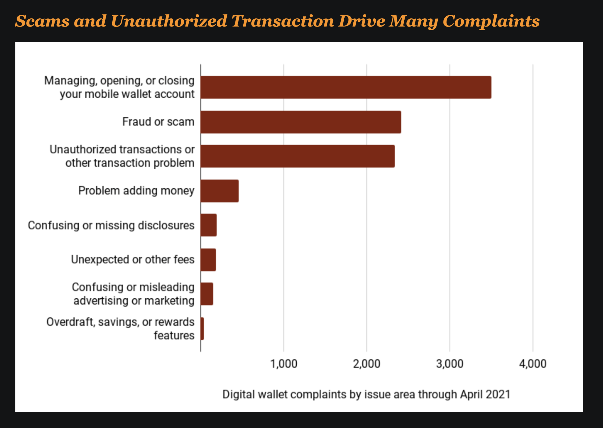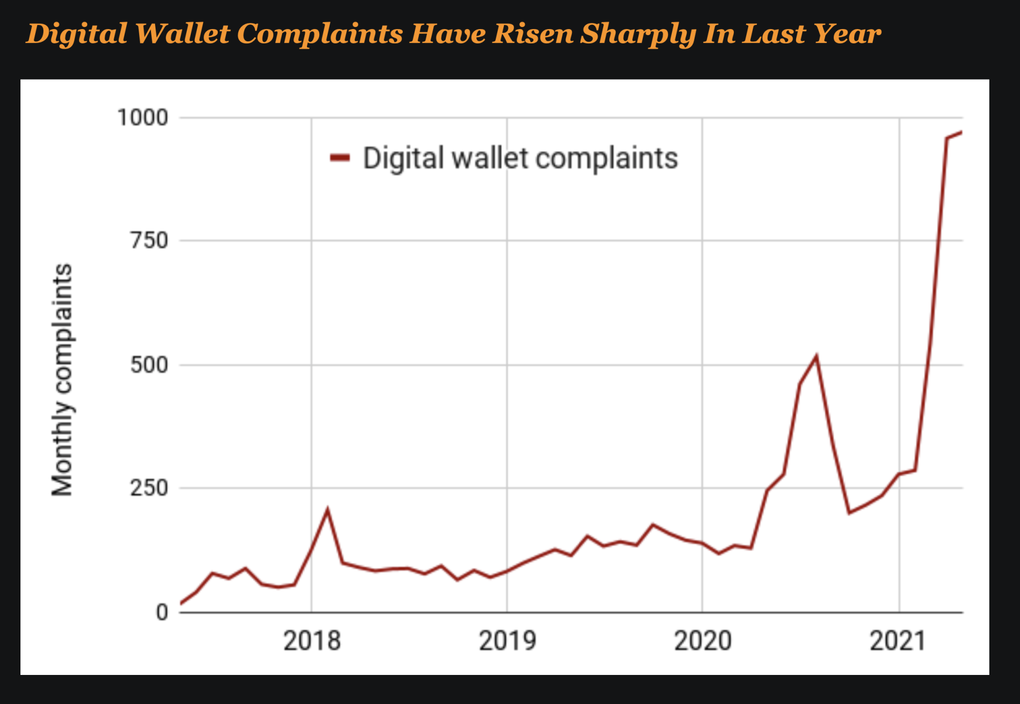 Consumer complaints about P2P payment apps such as PayPal, Venmo and Square have surged during the last year. In April of 2021, there were 970 digital wallet complaints — almost double the previous monthly high from July 2020.
