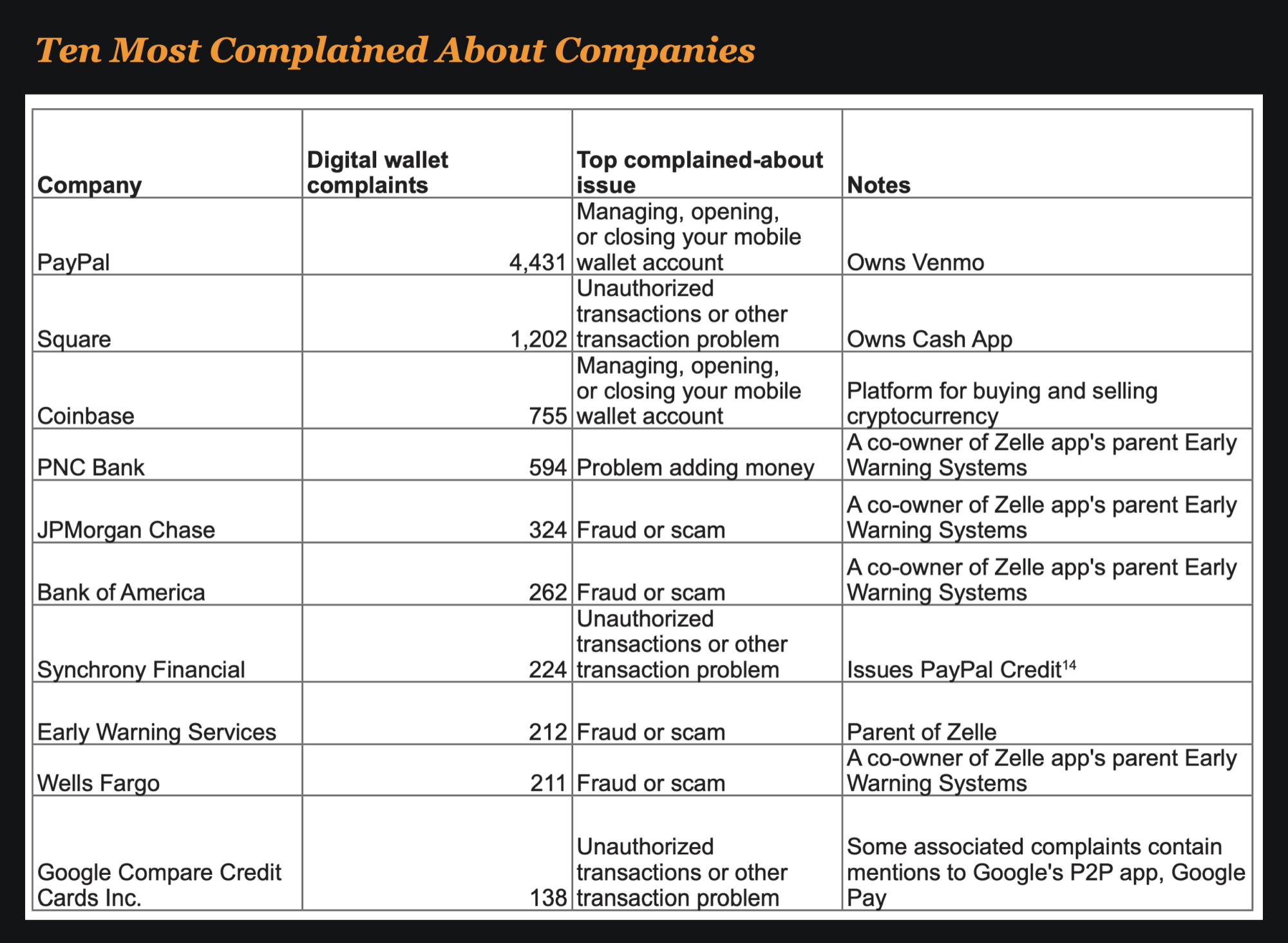 The report found that the top 10 most-complained-about companies accounted for 90 percent of all 9,277 digital wallet complaints, led by PayPal (which also owns the Venmo app), Square (which owns Cash App) and Coinbase, a cryptocurrency trading platform. Americans also complained a lot about several big banks, including PNC Bank, Chase, and Bank of America, (which are some of the co-owners of Early Warning Systems, the parent of Zelle, a leading P2P app).