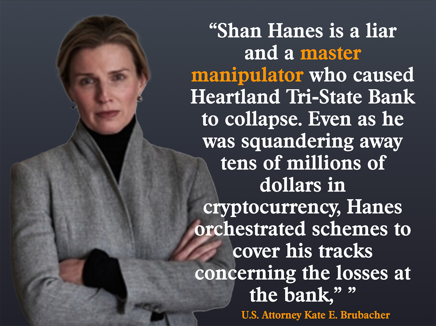 “Shan Hanes is a liar and a master manipulator who caused Heartland Tri-State Bank to collapse. Even as he was squandering away tens of millions of dollars in cryptocurrency, Hanes orchestrated schemes to cover his tracks concerning the losses at the bank,” said U.S. Attorney Kate E. Brubacher.