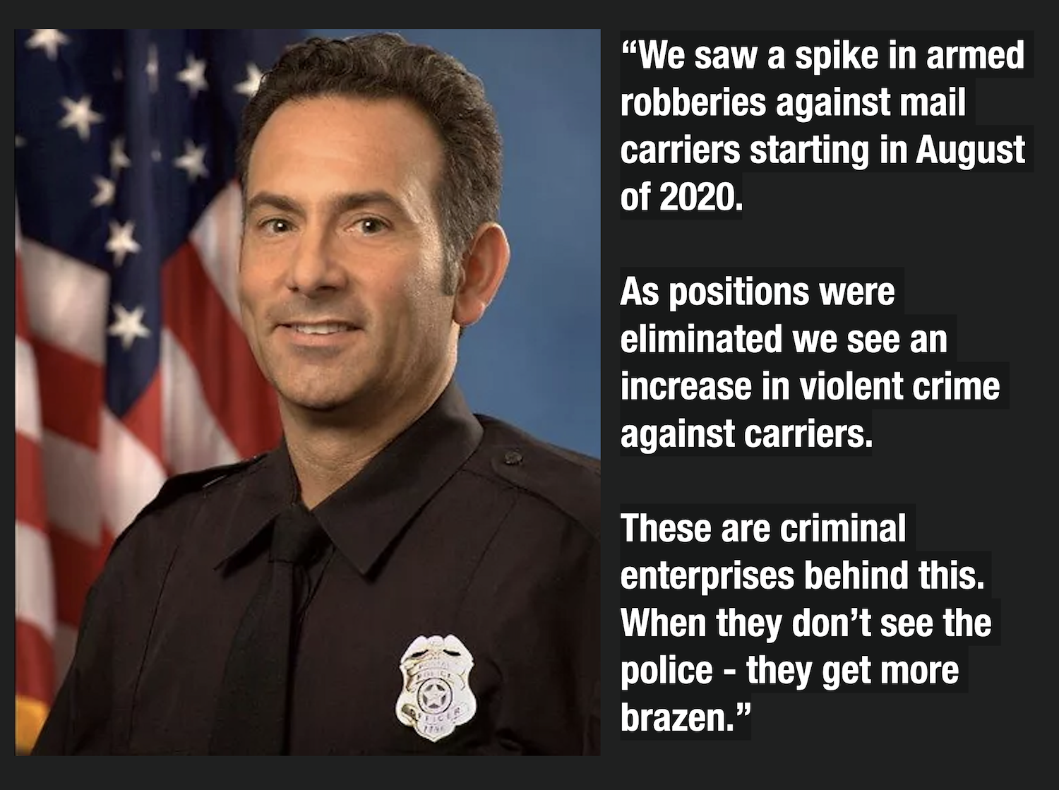 “Postal police carrier protection patrols were being scaled back beginning in 2018 and completely eliminated in the summer of 2020,” he said, “It is no coincidence that carrier robberies began to explode at the precise time when our carrier protection patrols were eliminated.”