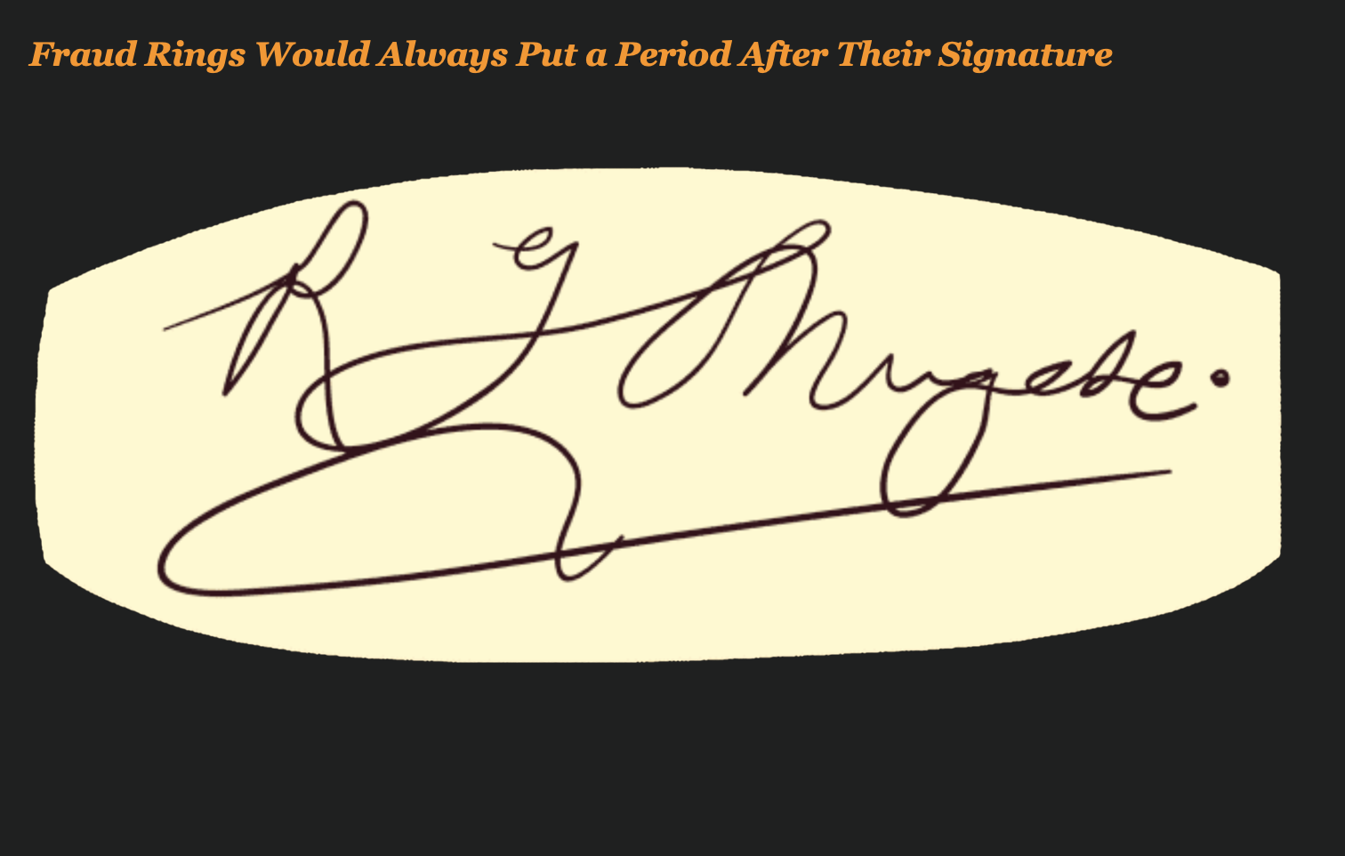 It turns out she was looking for the one tell-tale sign that all fraud rings were using at the time. She was looking for a pronounced dot or period at the end of the signature.