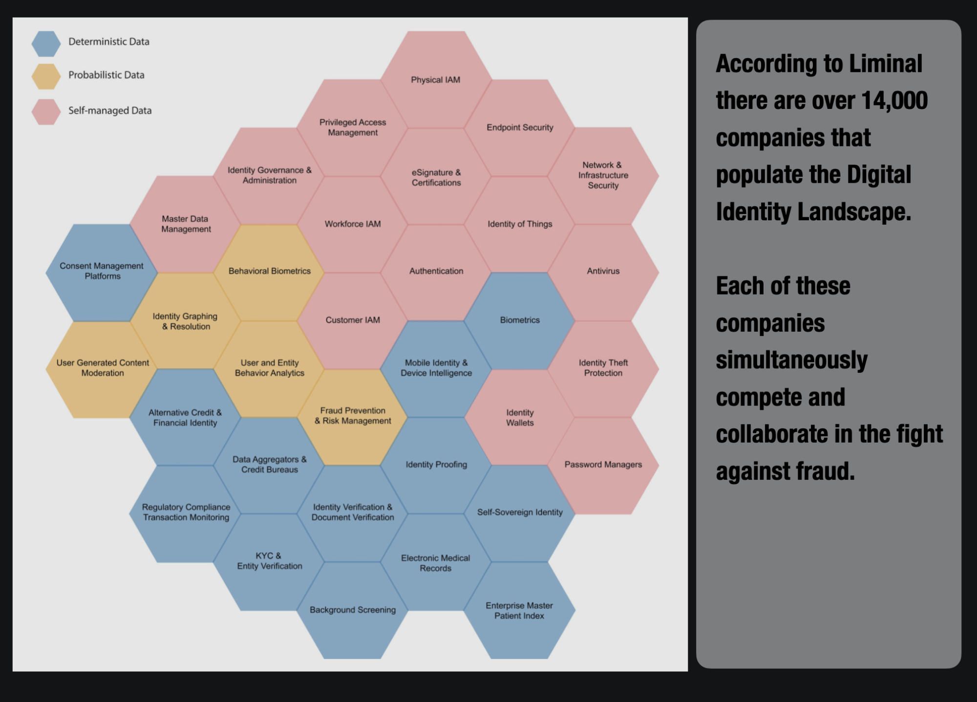 Now, identity fraud is a huge business. According to Liminal, thousands of companies are focused on helping resolve identities.