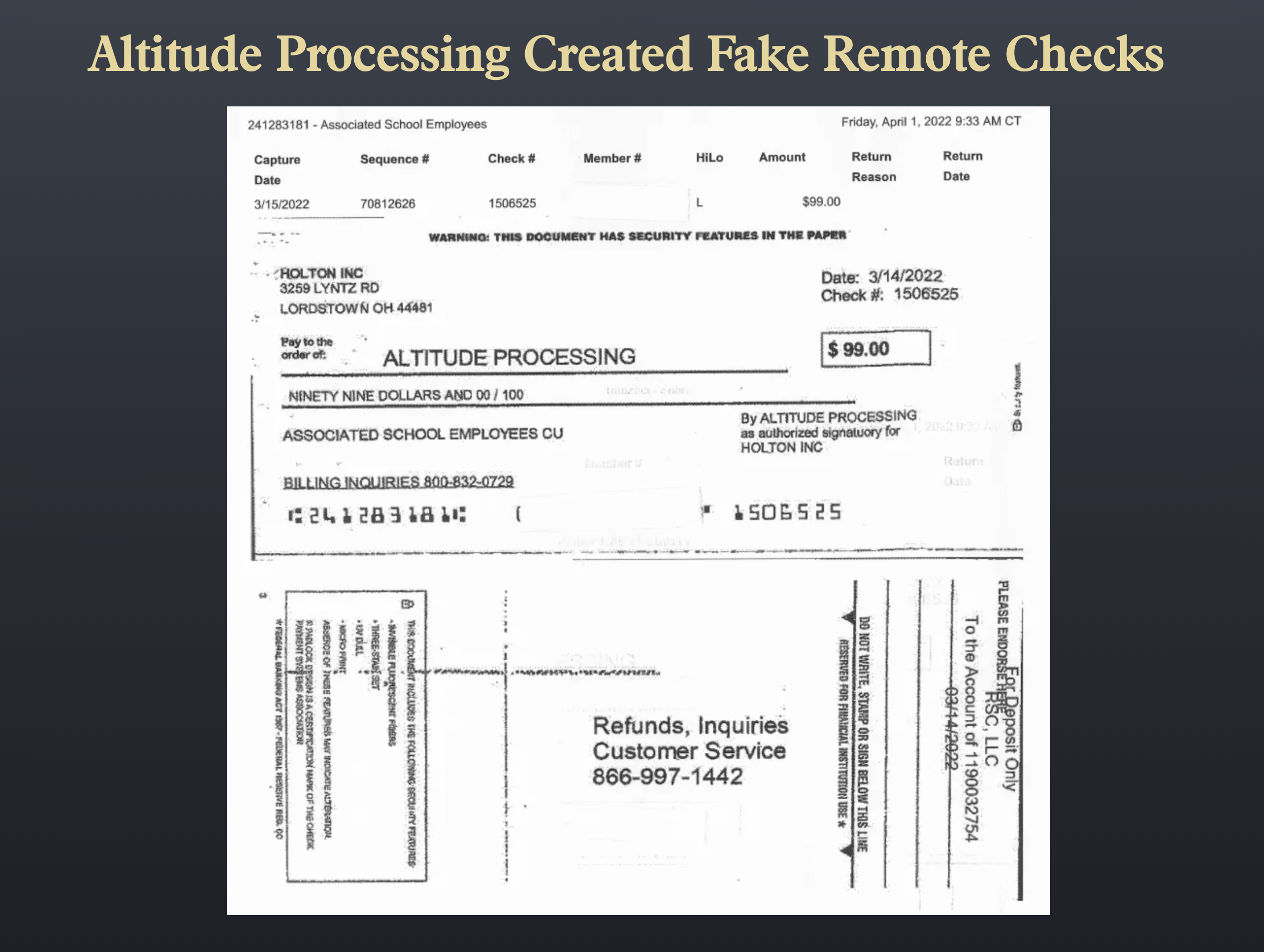 According to the Justice Department, Altitude Processing obtained checking account information from Small Businesses, created fraudulent unauthorized remote checks, and then debited the bank accounts of those businesses each month.
