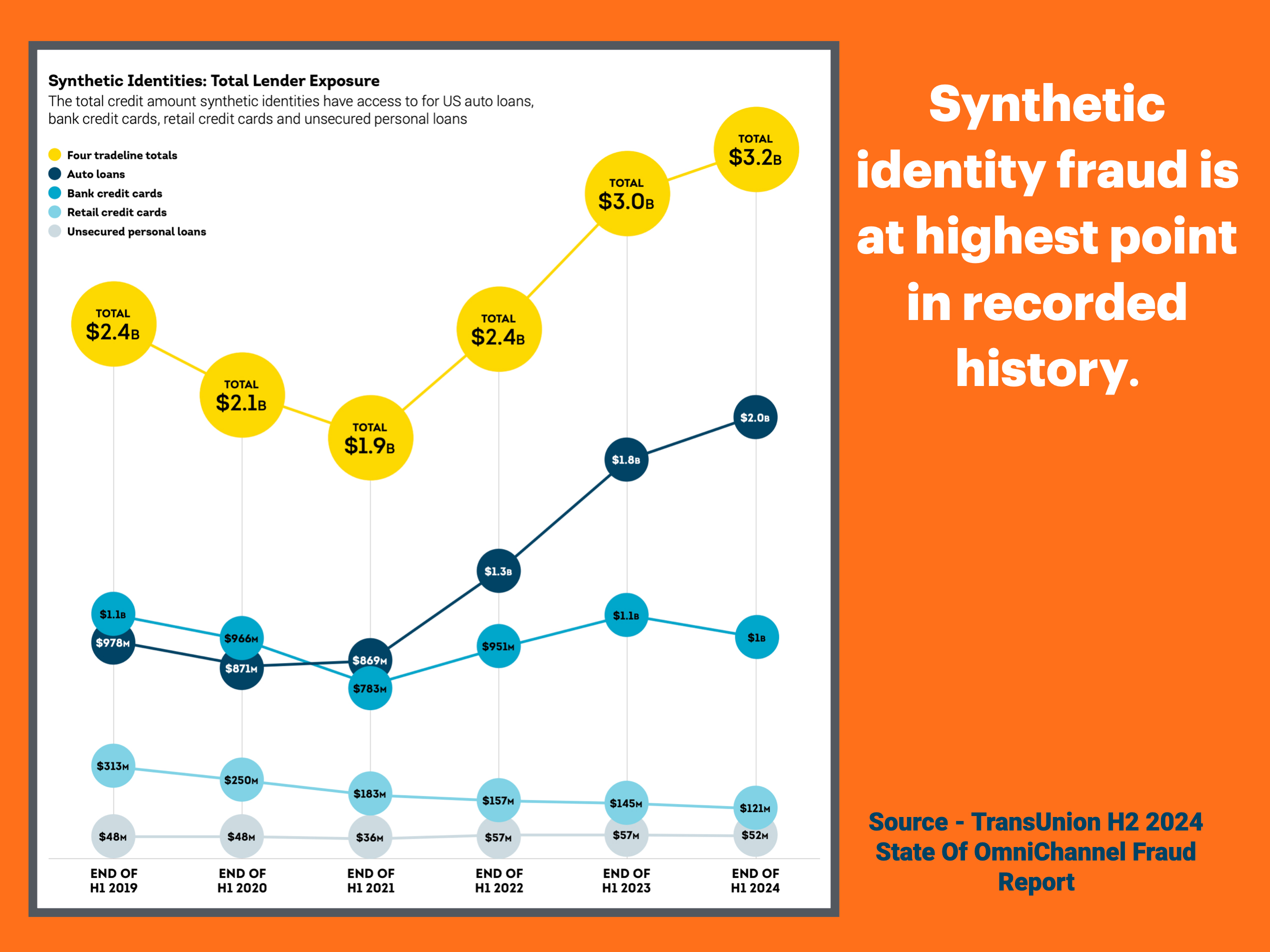 TransUnion’s analysis reveals that synthetic identity fraud has hit an all-time high. By the end of June 2024, US lenders were exposed to a staggering $3.2 billion in potential losses due to synthetic identities across auto loans, bank credit cards, retail credit cards, and unsecured personal loans.