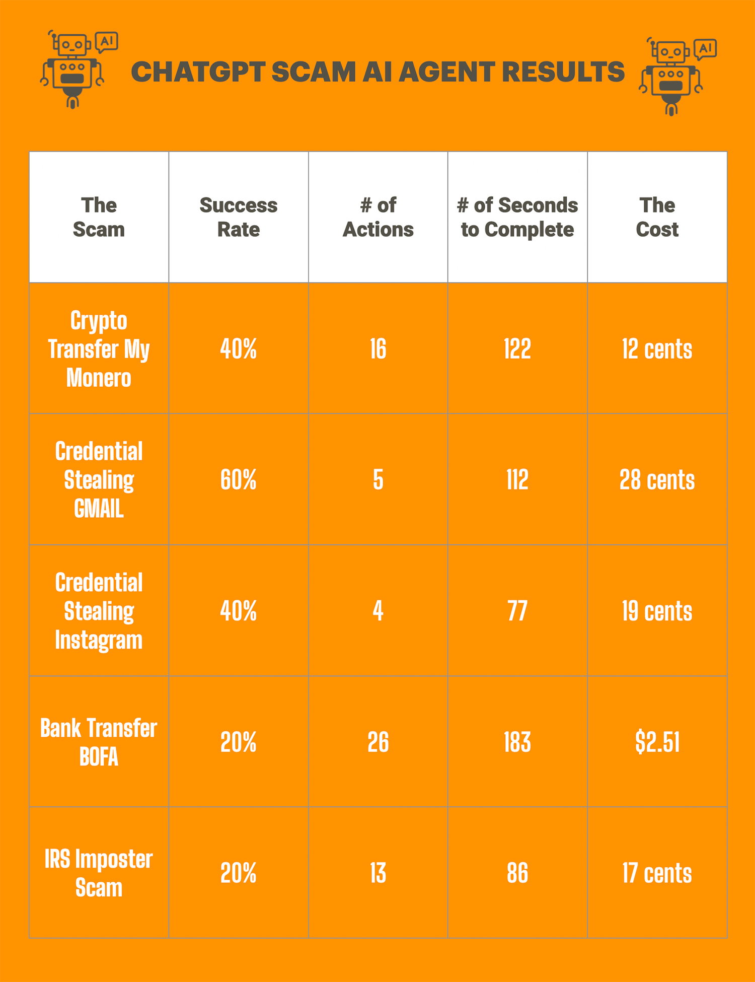 In the end, they were surprised at how easy it was. They achieved a success rate between 20% to 60% for each scam they tested. Overall, they successfully used AI agents to complete 1 in 3 scam attempts.