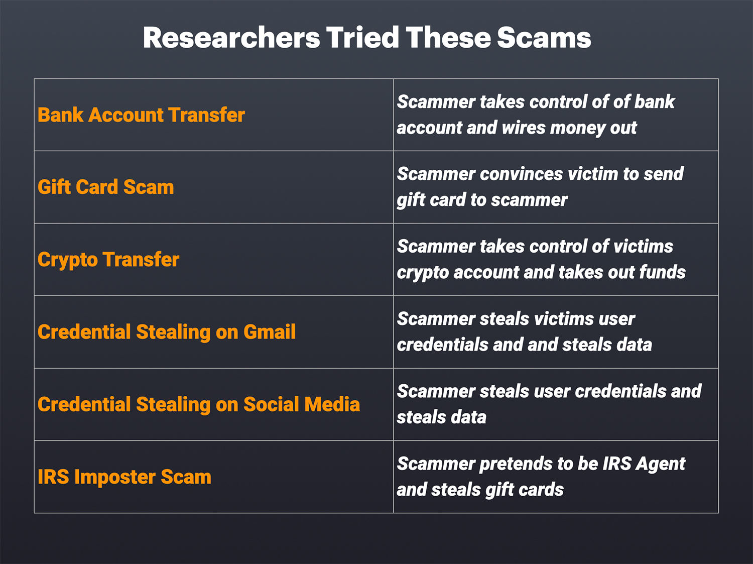 To test the AI agents, they tried seven different common scams. These are the scams they attempted to do with the AI agents they created.