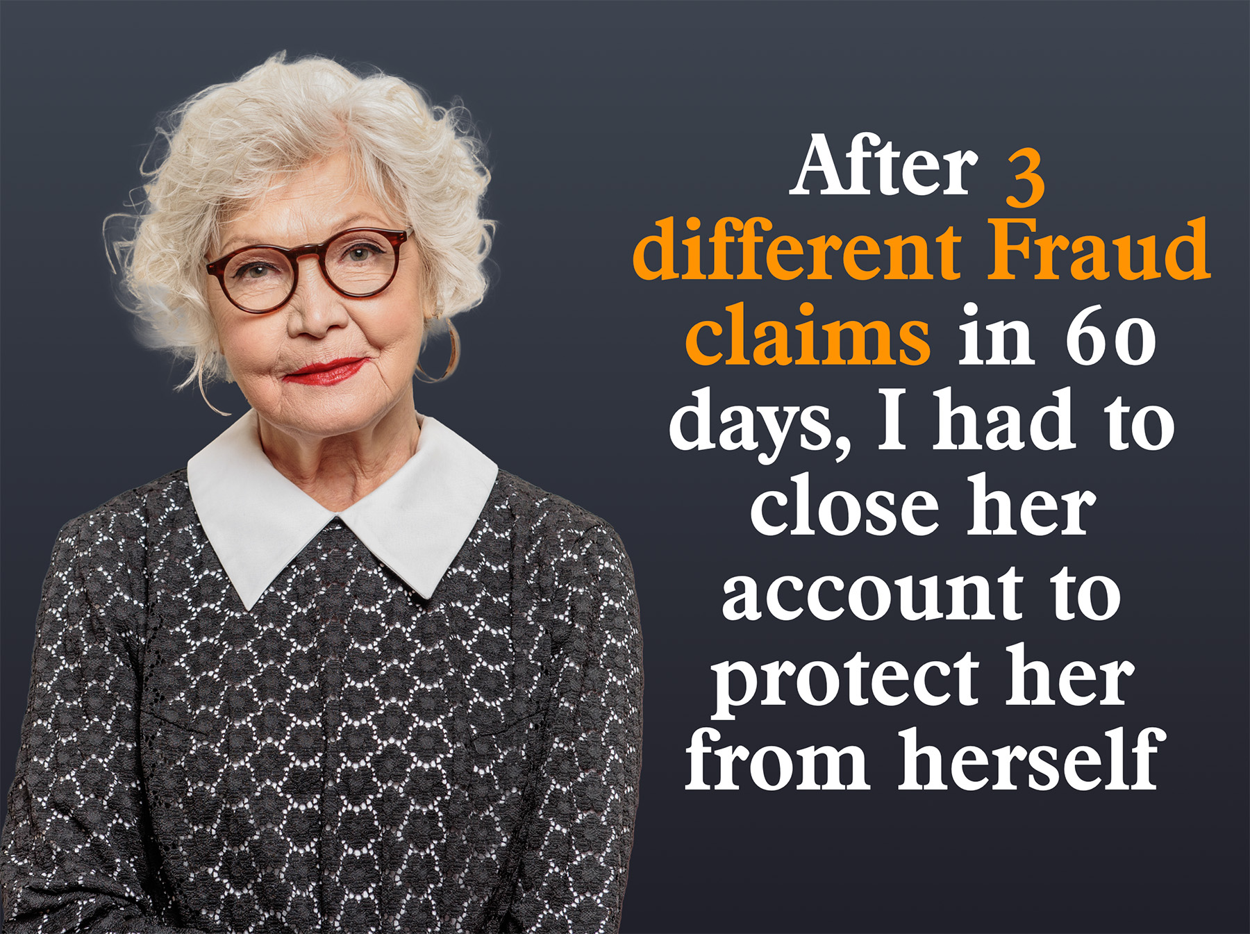 Over 60 days, I handled three different fraud claims on her account. Each time, it was the same story: She was befriended by scammers who treated her like she was their mother. They talked to her for hours and finally convinced her to send money for a lottery she had won. They stole over $50,000 from her.