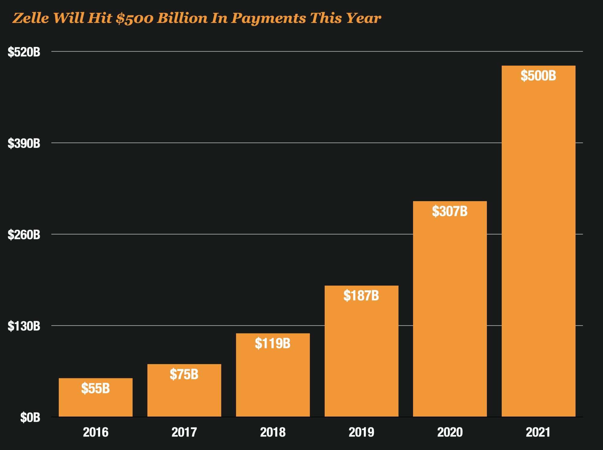 The rise of Zelle as one of the most popular payment apps is impressive. The service is closing in on a 40% share of the P2P market and will probably process over $500 billion in payments this year.