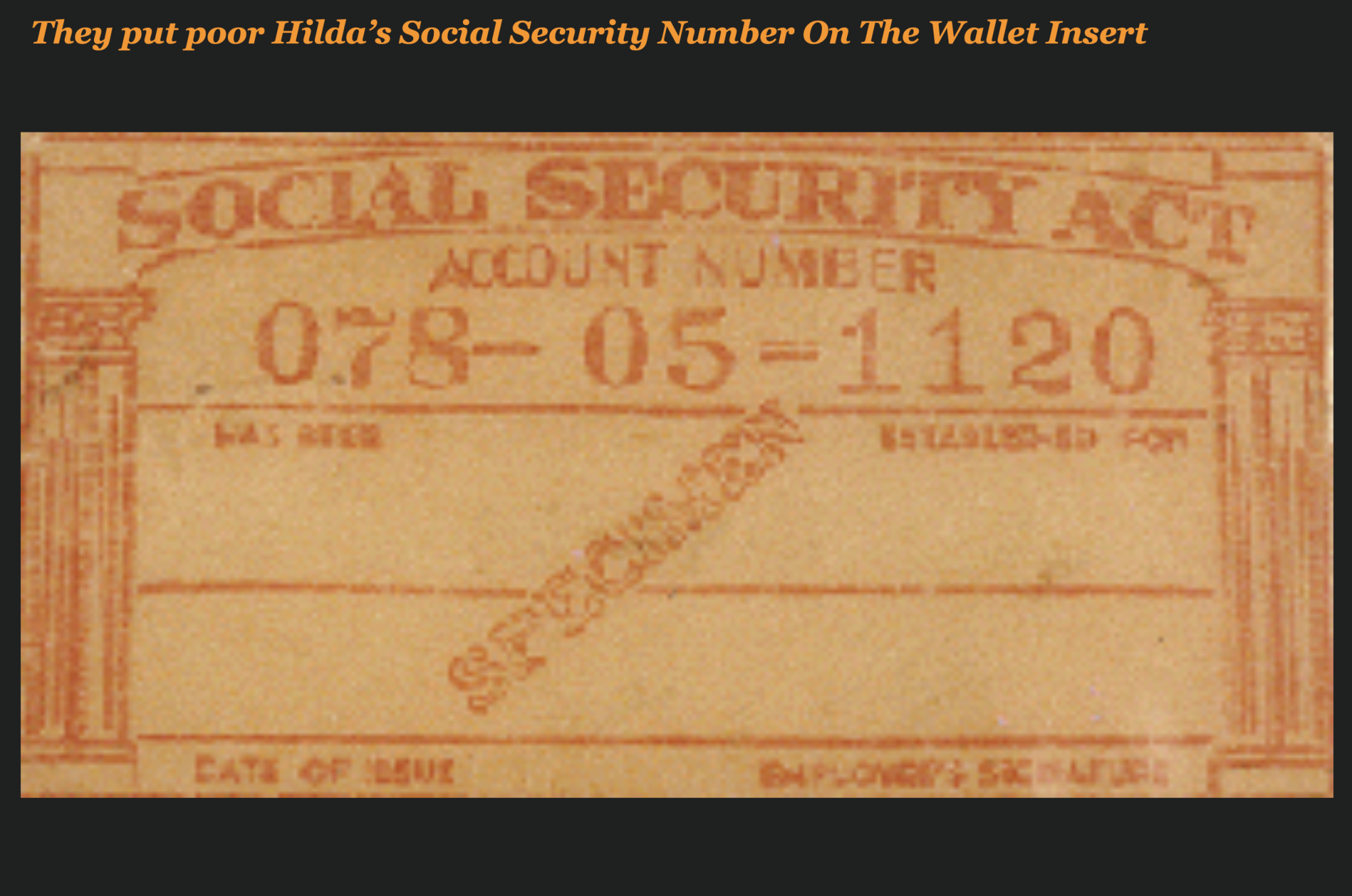 In 1938, a wallet manufacturer in Lockport, New York, decided they could improve their marketing by showing how a new Social Security card would look in their wallets. Kind of like those photos that they put in picture frames, right?